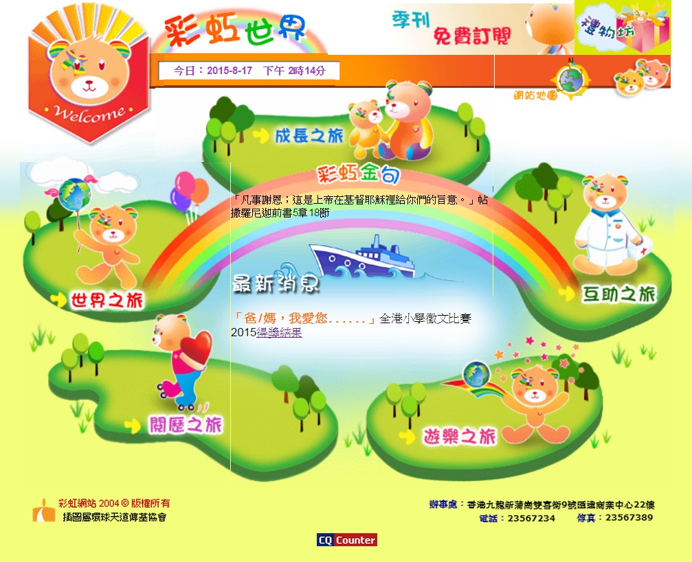 「彩虹世界」網站 立即進入 「彩 虹 世 界」 「彩虹世界」網站~~~ 讓孩子進入多元化、多色彩、多角度的世界,像彩虹有多種顏色 (紅、橙、黃、綠、青、藍、紫七色) 一樣;然而所有顏色匯聚在一起的時候,便會結合成白色,象徵歸回原本,要認識創造主。 網站內容是藉著人物故事、漫畫、見證文章、英語故事、靈修文章,以及各式各樣的遊戲及創作分享,讓小孩與父母一起思想,共同學習及成長。此外,我們也積極推動「彩虹世界」網站與各校網及教會網連結,期望能更有效率地將福音傳揚。 喜歡 正在載入...