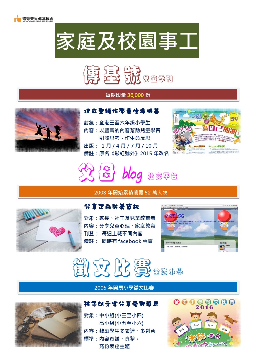 引發兒童思考,作生命反思 ※ 父母blog (家長、社工及兒童教育者網上平台) 分享兒童心理、家庭教育 ※徵文比賽 (孩子以文字分享愛與感恩) 鼓勵學生多表達、多創意 |
