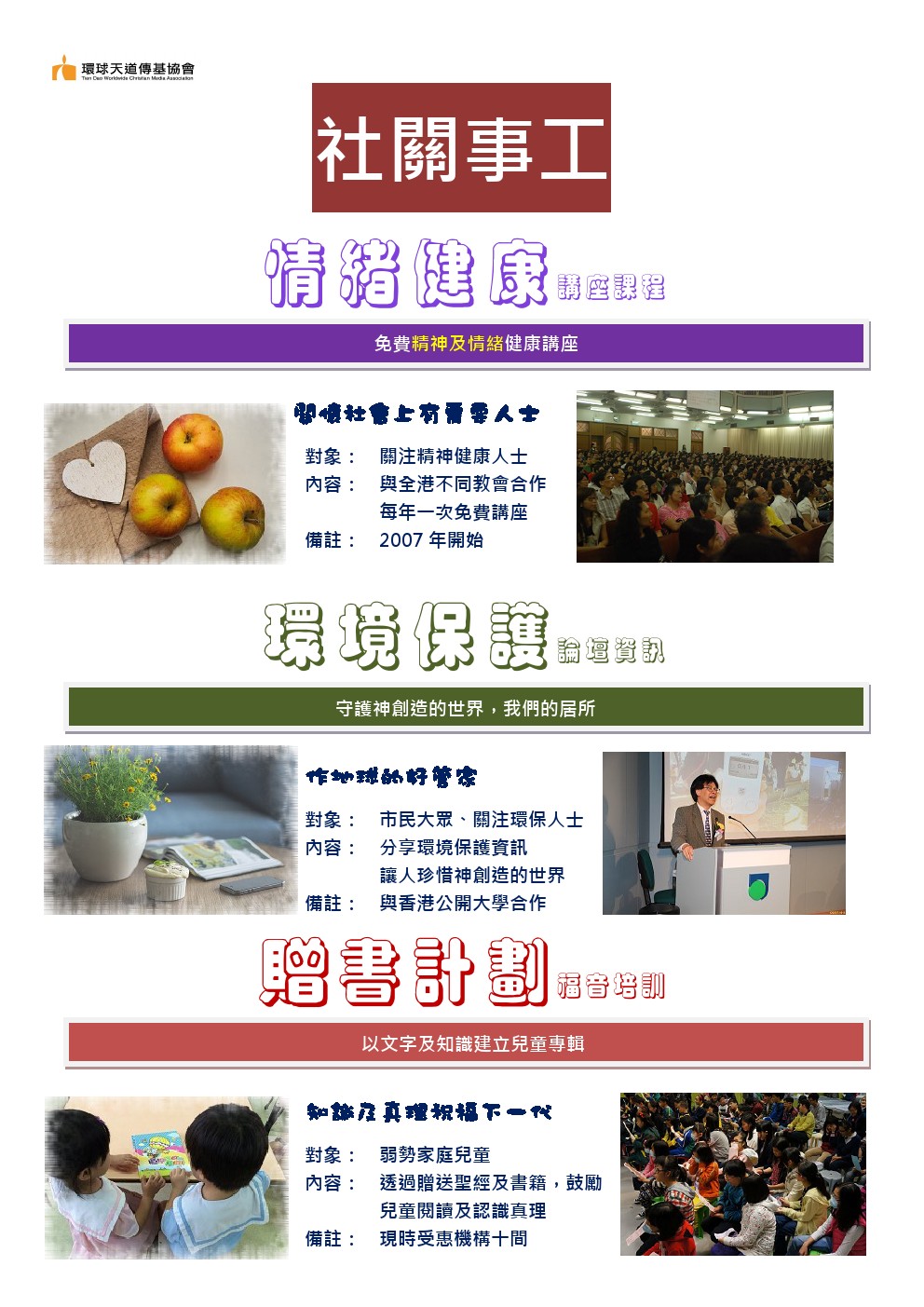 與全港不同教會合作每年一次免費講座思 ※ 環境保護論壇 (作地球的好管家) 讓人珍惜神創造的世界 ※ 贈書計劃 (以文字及知識建立兒童) 鼓勵兒童閱讀及認識真理 |