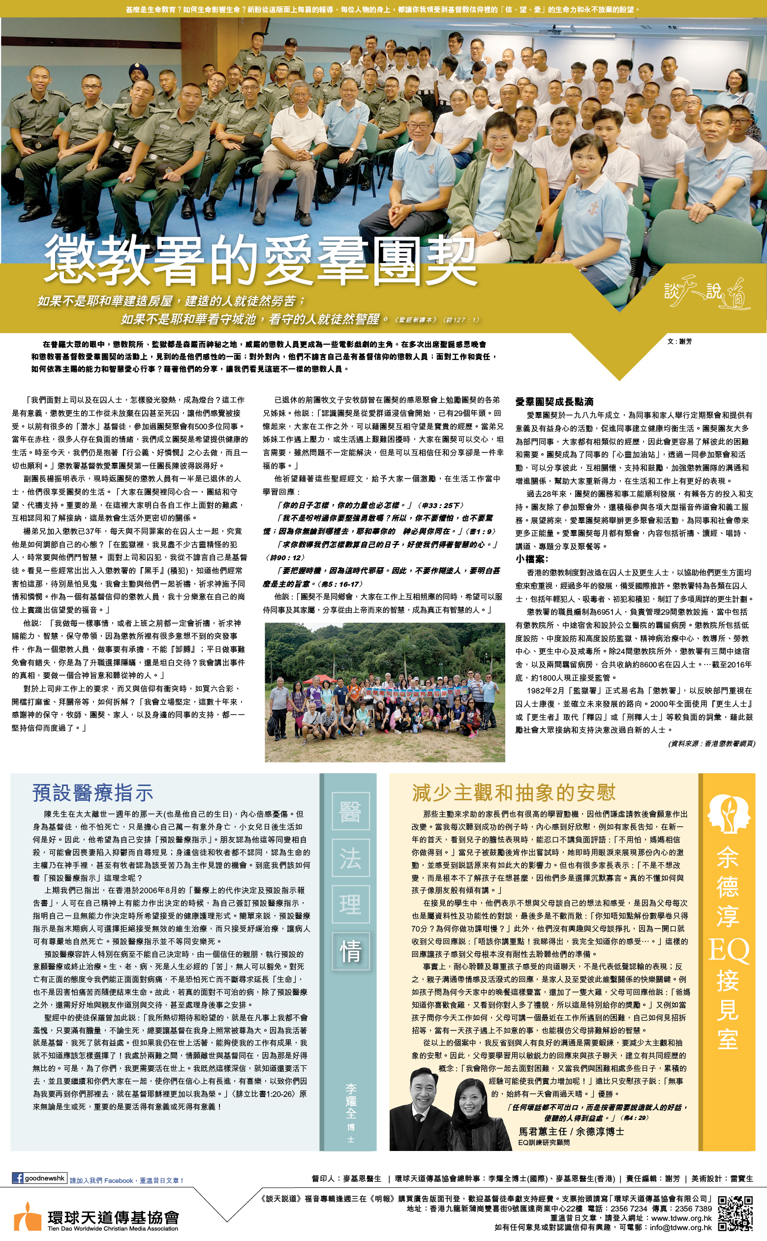 楊弟兄加入懲教已37年,每天與不同罪案的在囚人士一起,究竟他是如何調節自己的心態?「在監獄裡,我見盡不少古靈精怪的犯人,時常要與他們鬥智慧。 面對上司和囚犯,我從不諱言自己是基督徒。看見一些經常出出入入懲教署的『黑手』(積犯),知道他們經常害怕這那,待別是怕見鬼,我會主動與他們一起祈禱,祈求神施予同情和憐憫。作為一個有基督信仰的懲教人員,我十分樂意在自己的崗位上實踐出信望愛的福音。」