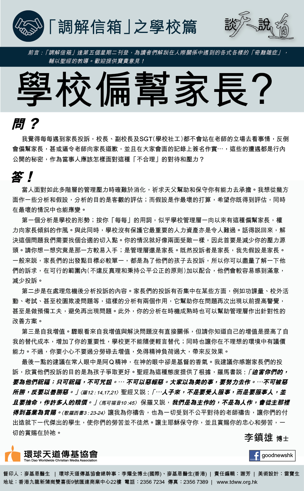 第一個分析是學校的形勢;按你「每每」的用詞,似乎學校管理層一向以來有這種偏幫家長,權力向家長傾斜的作風。與此同時,學校沒有保護它最重要的人力資產亦是令人難過。話得說回來,解決這個問題我們需要找個合適的切入點。你的情況就好像兩面受敵一樣,因此首要是減少你的壓力源頭。請你想一想究竟是那一方較易入手;是管理層還是家長。既然投訴者是家長,我先假設是家長。一般來說,家長們的出發點目標必較單一,都是為了他們的孩子去投訴,所以你可以盡量了解一下他們的訴求,在可行的範圍內(不違反真理和秉持公平公正的原則)加以配合,他們會較容易感到滿意,減少投訴。