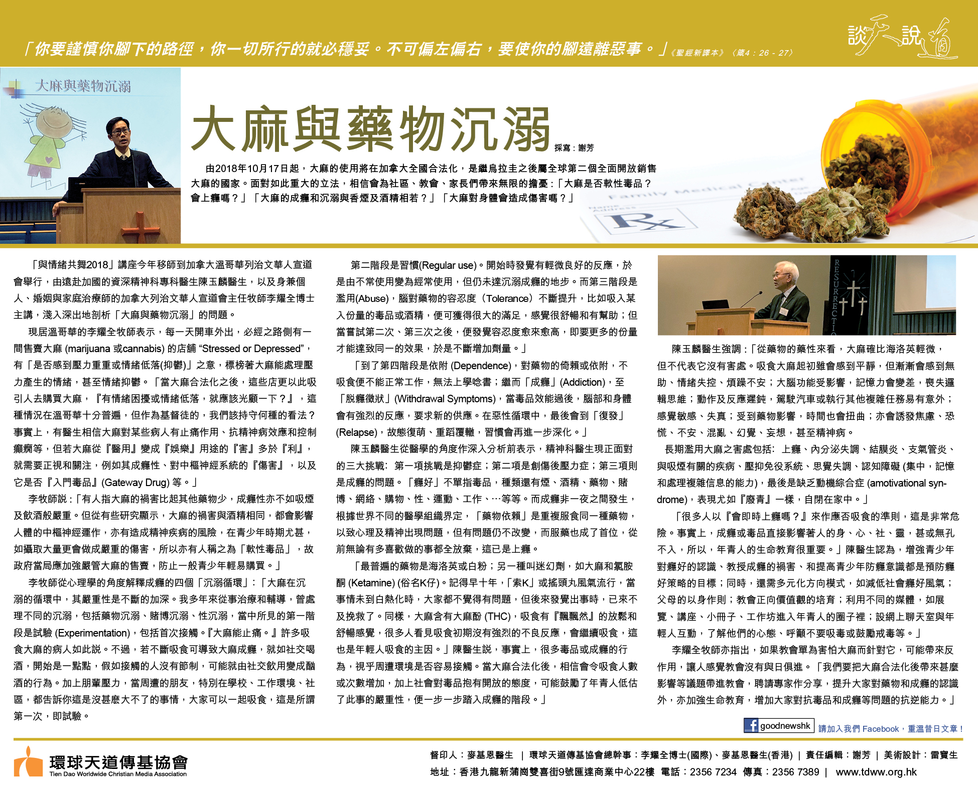 「與情緒共舞2018」講座今年移師到加拿大溫哥華列治文華人宣道會舉行,由遠赴加國的資深精神科專科醫生陳玉麟醫生,以及身兼個人、婚姻與家庭治療師的加拿大列治文華人宣道會主任牧師李耀全博士主講,淺入深出地剖析「大麻與藥物沉溺」的問題。