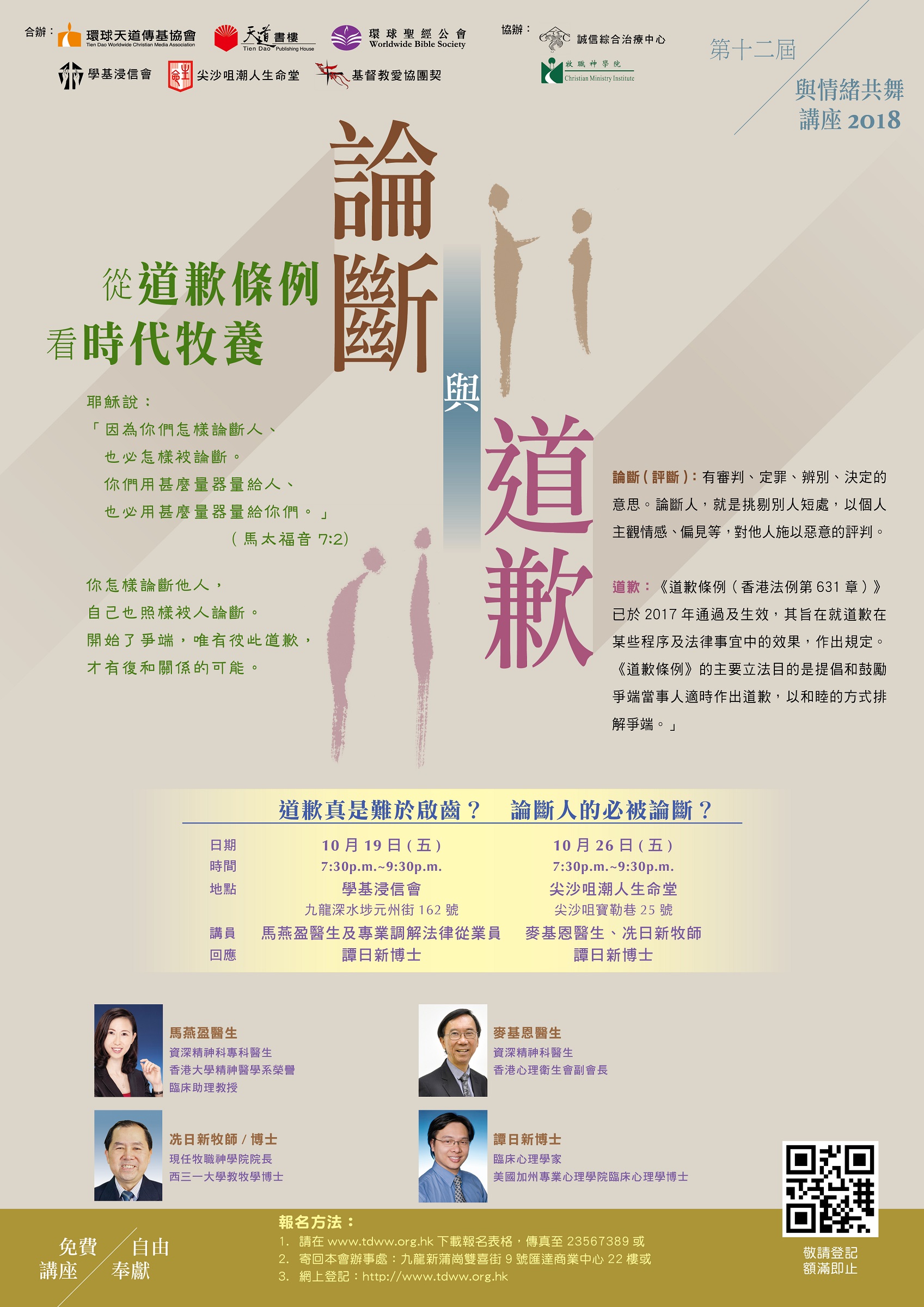 「論斷與道歉」從道歉條例看時代牧養 Posted on 2018 年 08 月 10 日 by tdwwhk 今年已完成,感謝支持 「與情緒共舞」講座已踏入第十二屆,今年籍以道歉條例看時代牧養,何謂道歉條例?道歉真是難於啟齒?論斷人的必被論斷?論斷心理是怎樣? 耶穌說:「因為你們怎樣論斷人、也必怎樣被論斷。你們用甚麼量器量給人、也必用甚麼量器量給你們。」(馬太福音7:2)你怎樣論斷他人,自己也照樣被人論斷。開始了爭端,唯有彼此道歉,才有復和關係的可能。 你願意一起了解及實踐嗎? 10月19日「與情緒共舞」講座__道歉難於啟齒?順利完成 10月26日「與情緒共舞」講座__論斷人的必被論斷?順利完成 分享此文: 分享到 WhatsApp(在新視窗中開啟) WhatsApp Tweet 按一下即可以電子郵件傳送連結給朋友(在新視窗中開啟) 電子郵件 喜歡 正在載入...