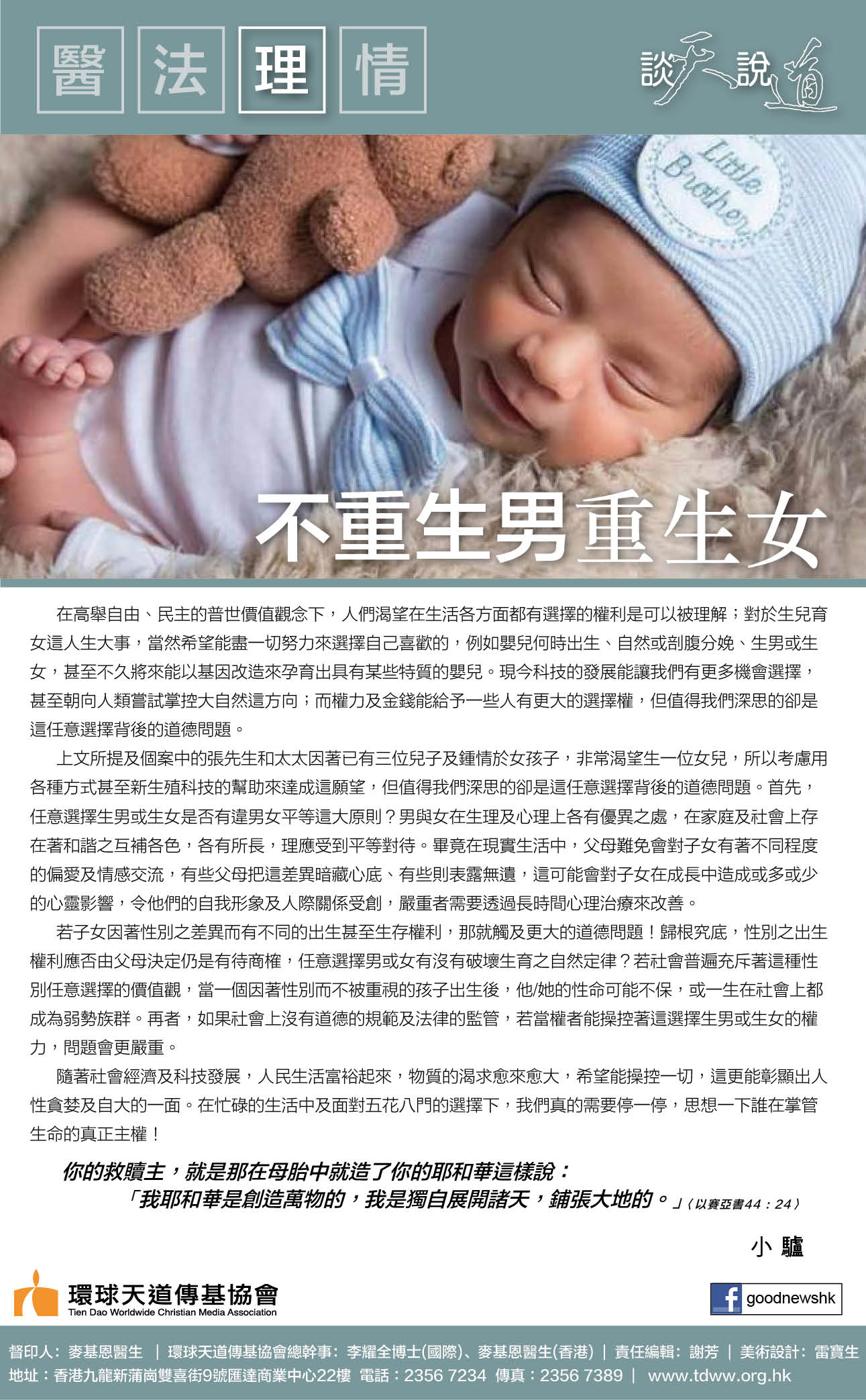 若子女因著性別之差異而有不同的出生甚至生存權利,那就觸及更大的道德問題!歸根究底,性別之出生權利應否由父母決定仍是有待商榷,任意選擇男或女有沒有破壞生育之自然定律?若社會普遍充斥著這種性別任意選擇的價值觀,當一個因著性別而不被重視的孩子出生後,他/她的性命可能不保,或一生在社會上都成為弱勢族群。再者,如果社會上沒有道德的規範及法律的監管,若當權者能操控著這選擇生男或生女的權力,問題會更嚴重。