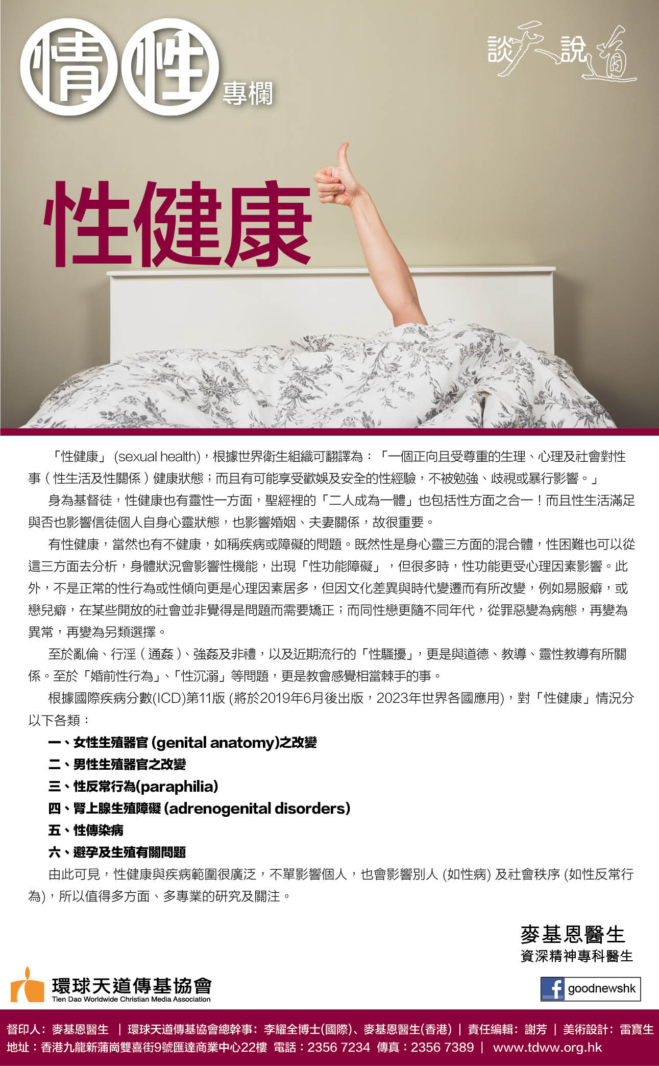 根據國際疾病分數(ICD)第11版 (將於2019年6月後出版,2023年世界各國應用),對「性健康」情況分以下各類:
