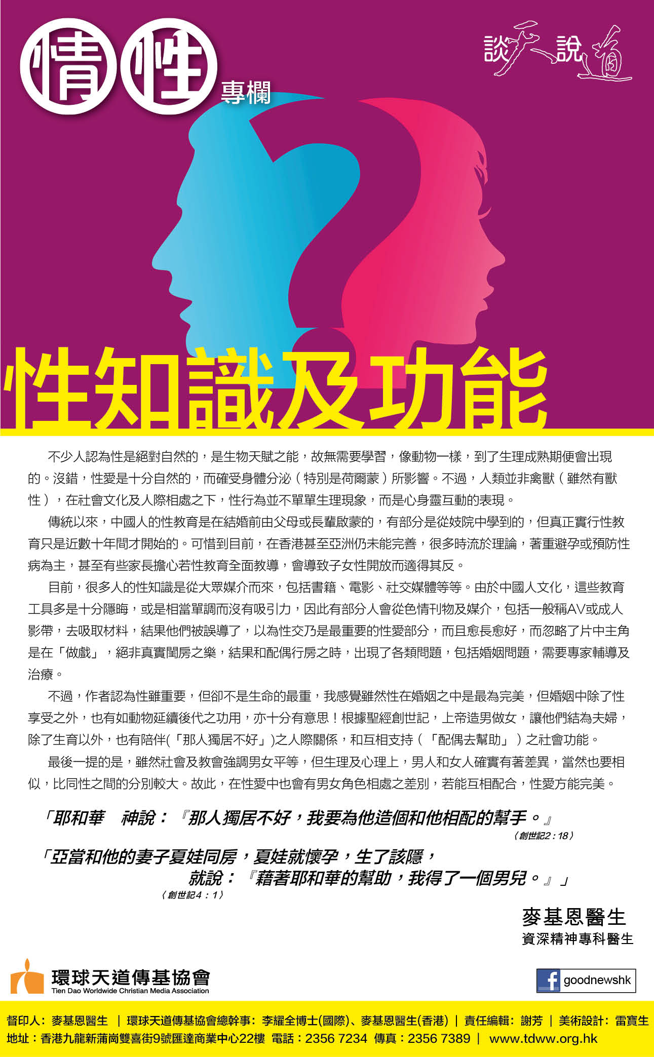 最後一提的是,雖然社會及教會強調男女平等,但生理及心理上,男人和女人確實有著差異,當然也要相似,比同性之間的分別較大。故此,在性愛中也會有男女角色相處之差別,若能互相配合,性愛方能完美。