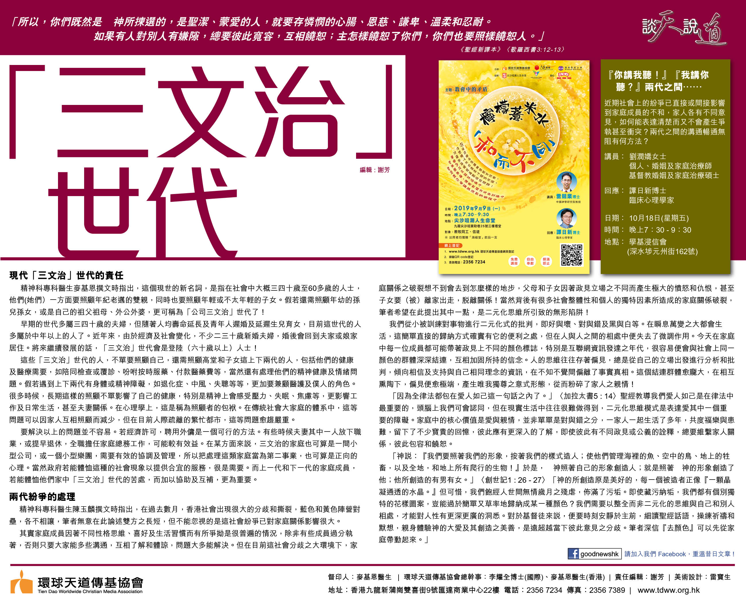 精神科專科醫生陳玉麟撰文時指出,在過去數月,香港社會出現很大的分歧和撕裂,藍色和黃色陣營對壘,各不相讓,筆者無意在此論述雙方之長短,但不能忽視的是這社會紛爭已對家庭關係影響很大。