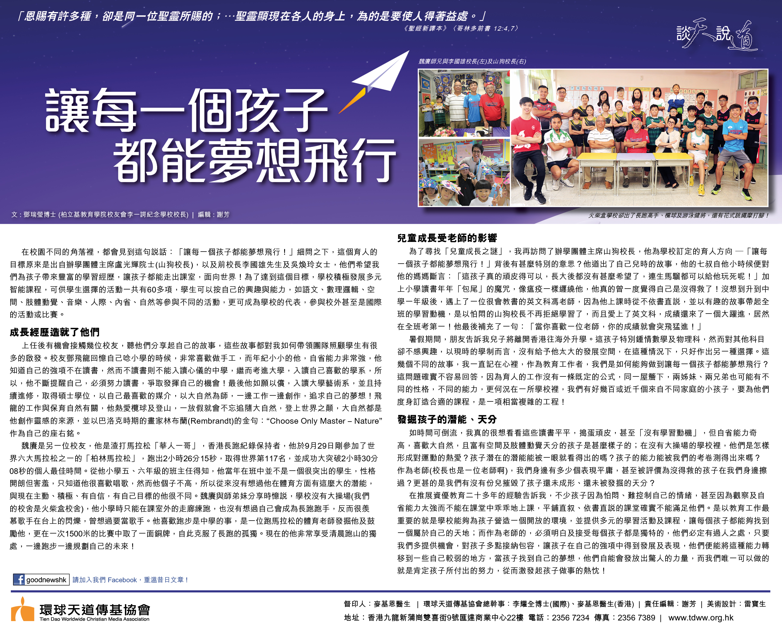 暑假期間,朋友告訴我兒子將離開香港往海外升學。這孩子特別鍾情數學及物理科,然而對其他科目卻不感興趣,以現時的學制而言,沒有給予他太大的發展空間,在這種情況下,只好作出另一種選擇。這幾個不同的故事,我一直記在心裡,作為教育工作者,我們是如何能夠做到讓每一個孩子都能夢想飛行?這問題確實不容易回答,因為育人的工作沒有一條既定的公式,同一屋簷下,兩姊妹、兩兄弟也可能有不同的性格,不同的能力,更何況在一所學校裡,我們有好幾百或近千個來自不同家庭的小孩子,要為他們度身訂造合適的課程,是一項相當複雜的工程!