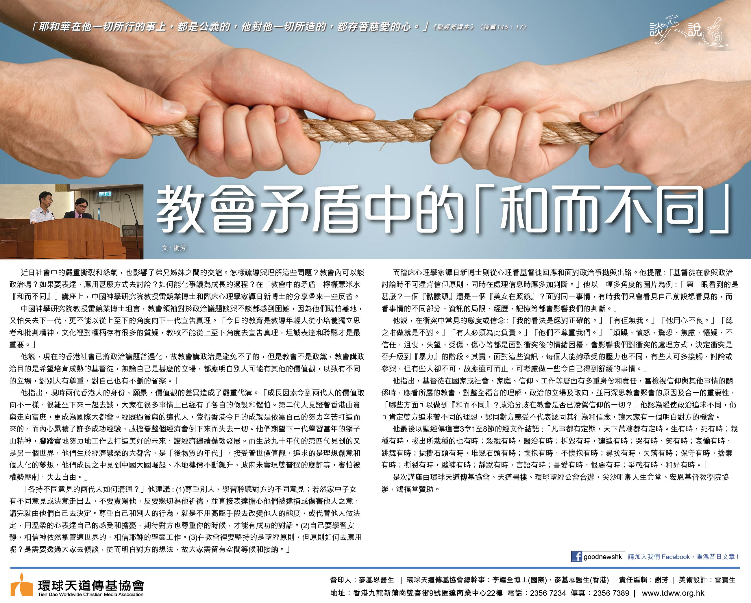近日社會中的嚴重撕裂和怨氣,也影響了弟兄姊妹之間的交誼。怎樣疏導與理解這些問題?教會內可以談政治嗎?如果要表達,應用甚麼方式去討論?如何能化爭議為成長的過程?在「教會中的矛盾—檸檬薏米水『和而不同』」講座上,中國神學研究院教授雷競業博士和臨床心理學家譚日新博士的分享帶來一些反省。