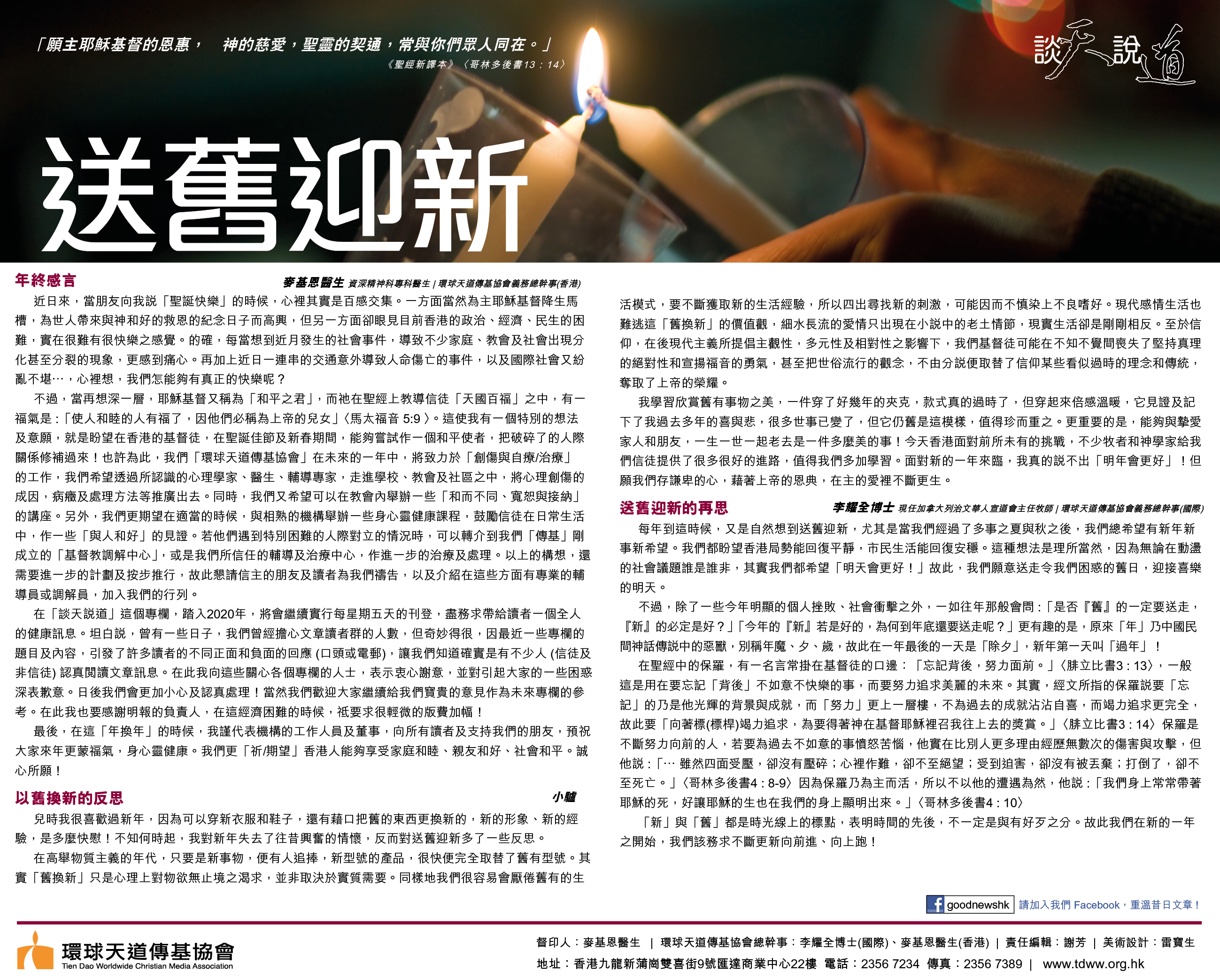 在「談天說道」這個專欄,踏入2020年,將會繼續實行每星期五天的刊登,盡務求帶給讀者一個全人的健康訊息。坦白說,曾有一些日子,我們曾經擔心文章讀者群的人數,但奇妙得很,因最近一些專欄的題目及內容,引發了許多讀者的不同正面和負面的回應(口頭或電郵),讓我們知道確實是有不少人(信徒及非信徒)認真閱讀文章訊息。在此我向這些關心各個專欄的人士,表示衷心謝意,並對引起大家的一些困惑深表歉意。日後我們會更加小心及認真處理!當然我們歡迎大家繼續給我們寶貴的意見作為未來專欄的參考。在此我也要感謝明報的負責人,在這經濟困難的時候,祗要求很輕微的版費加幅!