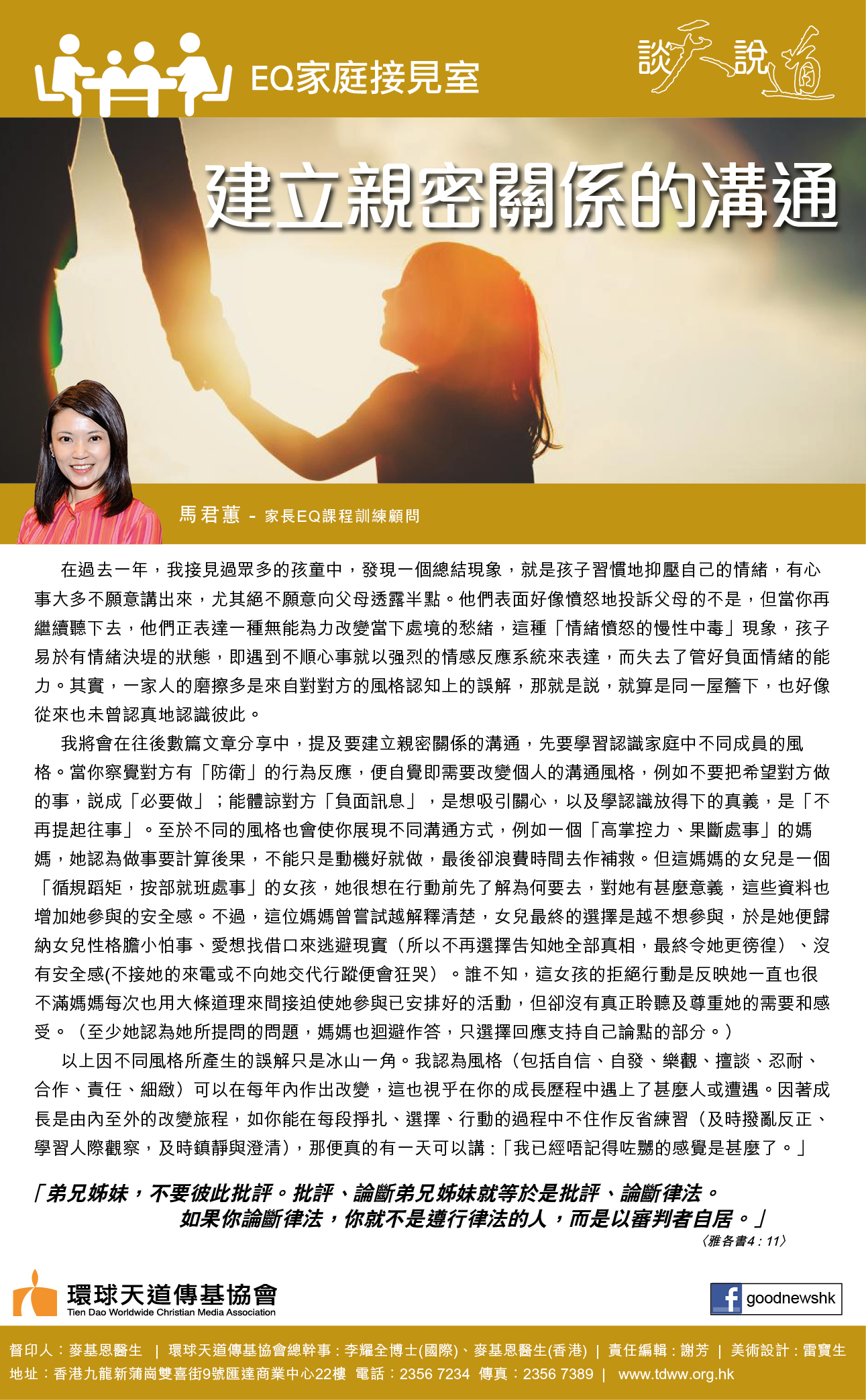 我將會在往後數篇文章分享中,提及要建立親密關係的溝通,先要學習認識家庭中不同成員的風格。當你察覺對方有「防衛」的行為反應,便自覺即需要改變個人的溝通風格,例如不要把希望對方做的事,說成「必要做」;能體諒對方「負面訊息」,是想吸引關心,以及學認識放得下的真義,是「不再提起往事」。至於不同的風格也會使你展現不同溝通方式,例如一個「高掌控力、果斷處事」的媽媽,她認為做事要計算後果,不能只是動機好就做,最後卻浪費時間去作補救。但這媽媽的女兒是一個「循規蹈矩,按部就班處事」的女孩,她很想在行動前先了解為何要去,對她有甚麼意義,這些資料也增加她參與的安全感。不過,這位媽媽曾嘗試越解釋清楚,女兒最終的選擇是越不想參與,於是她便歸納女兒性格膽小怕事、愛想找借口來逃避現實(所以不再選擇告知她全部真相,最終令她更徬徨)、沒有安全感(不接她的來電或不向她交代行蹤便會狂哭)。誰不知,這女孩的拒絕行動是反映她一直也很不滿媽媽每次也用大條道理來間接迫使她參與已安排好的活動,但卻沒有真正聆聽及尊重她的需要和感受。(至少她認為她所提問的問題,媽媽也迴避作答,只選擇回應支持自己論點的部分。)