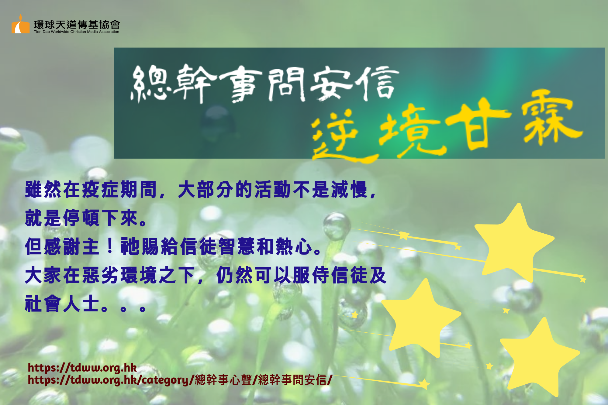我相信大家已經經驗到在疫症期間,大部分的活動(包括教會及其他宗教活動)不是減慢,就是停頓下來。我們環球天道傳基協會面對面的聚會(包括講座及培訓課程),也被迫改期,甚至取消。但是,感謝主!祂賜給信徒智慧和熱心。大家在惡劣環境之下,仍然可以服侍信徒及社會人士。由此之故,大部分教會仍然可以在網上繼續進行主日崇拜、主日學課程,甚至網上團契及小組溝通分享。