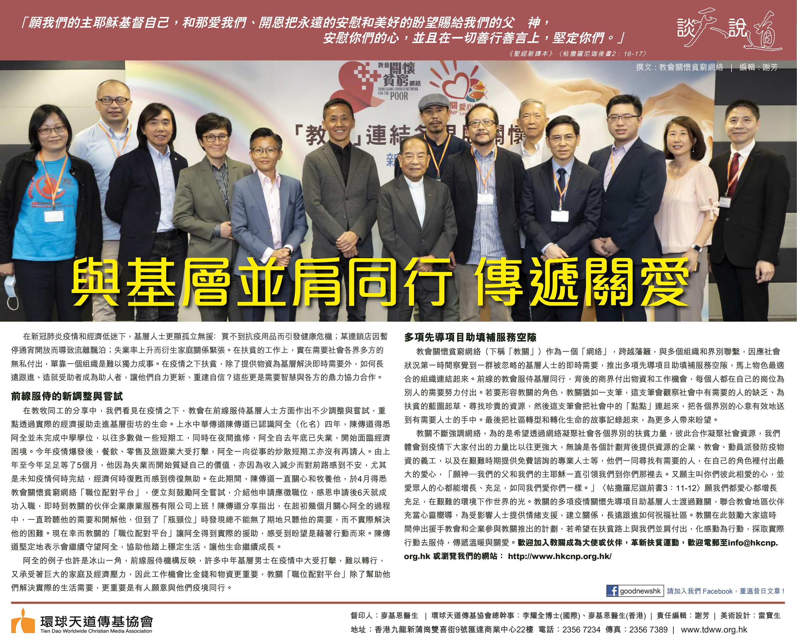 在新冠肺炎疫情和經濟低迷下,基層人士更顯孤立無援﹕買不到抗疫用品而引發健康危機;某連鎖店因暫停通宵開放而導致流離飄泊;失業率上升而衍生家庭關係緊張。在扶貧的工作上,實在需要社會各界多方的無私付出,單靠一個組織是難以獨力成事。在疫情之下扶貧,除了提供物資為基層解決即時需要外,如何長遠跟進、造就受助者成為助人者,讓他們自力更新、重建自信?這些更是需要智慧與各方的鼎力協力合作。