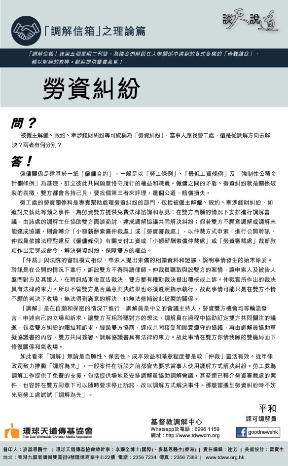僱傭關係是建基於一紙「僱傭合約」,一般是以「勞工條例」、「最低工資條例」及「強制性公積金計劃條例」為基礎,訂立彼此共同願意恪守履行的權益和職責。僱傭之間的矛盾丶勞資糾紛就是關係破裂的表徴,雙方都會各持己見,要找個第三者來評理,還個公道,賠償損失。