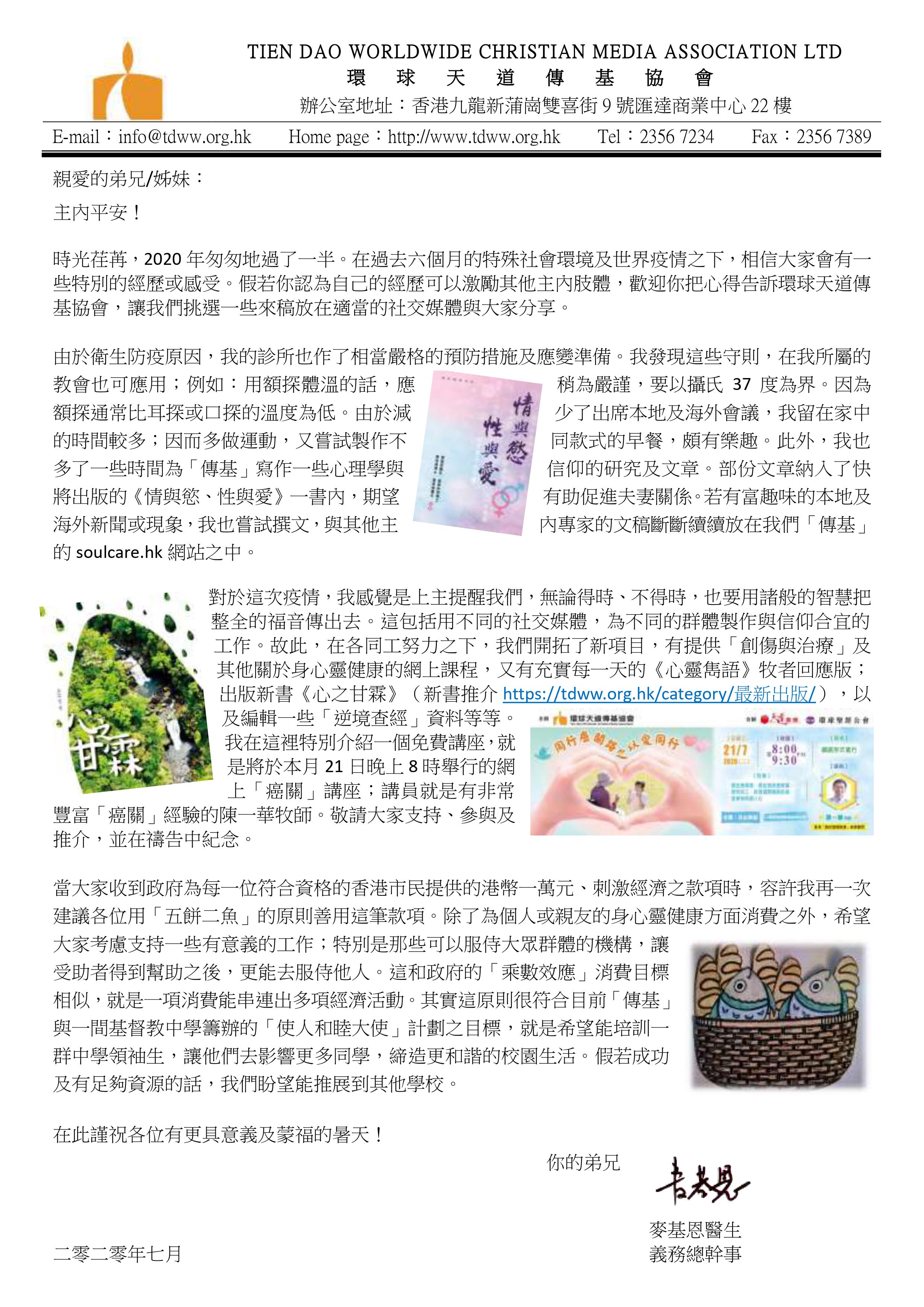 對於這次疫情,我感覺是上主提醒我們,無論得時、不得時,也要用諸般的智慧把整全的福音傳出去。這包括用不同的社交媒體,為不同的群體製作與信仰合宜的工作。故此,在各同工努力之下,我們開拓了新項目,有提供「創傷與治療」及其他關於身心靈健康的網上課程,又有充實每一天的《心靈雋語》牧者回應版;出版新書《心之甘霖》(新書推介https://tdww.org.hk/category/最新出版/),以及編輯一些「逆境查經」資料等等。我在這裡特別介紹一個免費講座,就是將於本月21日晚上8時舉行的網上「癌關」講座;講員就是有非常豐富「癌關」經驗的陳一華牧師。敬請大家支持、參與及推介,並在禱告中紀念。