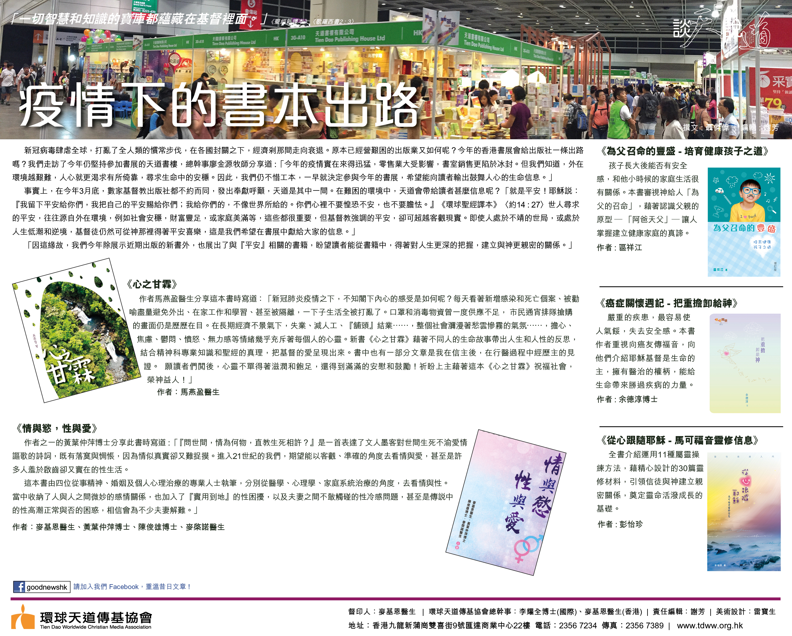 新冠病毒肆虐全球,打亂了全人類的慣常步伐,在各國封關之下,經濟剎那間走向衰退。原本已經營艱困的出版業又如何呢?今年的香港書展會給出版社一條出路嗎?我們走訪了今年仍堅持參加書展的天道書樓,總幹事廖金源牧師分享道﹕「今年的疫情實在來得迅猛,零售業大受影響,書室銷售更陷於冰封。但我們知道,外在環境越艱難,人心就更渴求有所倚靠,尋求生命中的安穩。因此,我們仍不惜工本,一早就決定參與今年的書展,希望能向讀者輸出鼓舞人心的生命信息。」