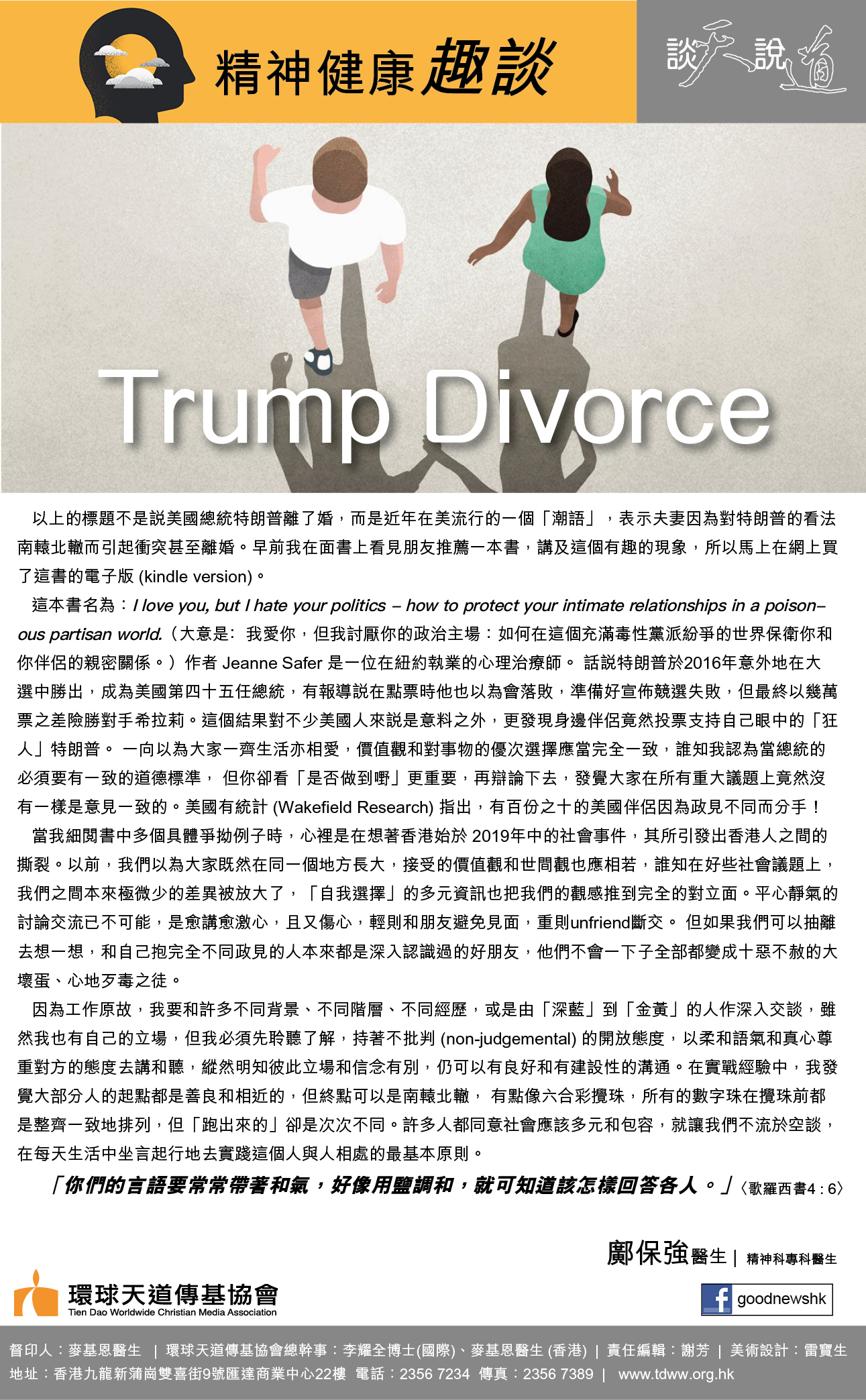 以上的標題不是說美國總統特朗普離了婚,而是近年在美流行的一個「潮語」,表示夫妻因為對特朗普的看法南轅北轍而引起衝突甚至離婚。早前我在面書上看見朋友推薦一本書,講及這個有趣的現象,所以馬上在網上買了這書的電子版(kindle version)。