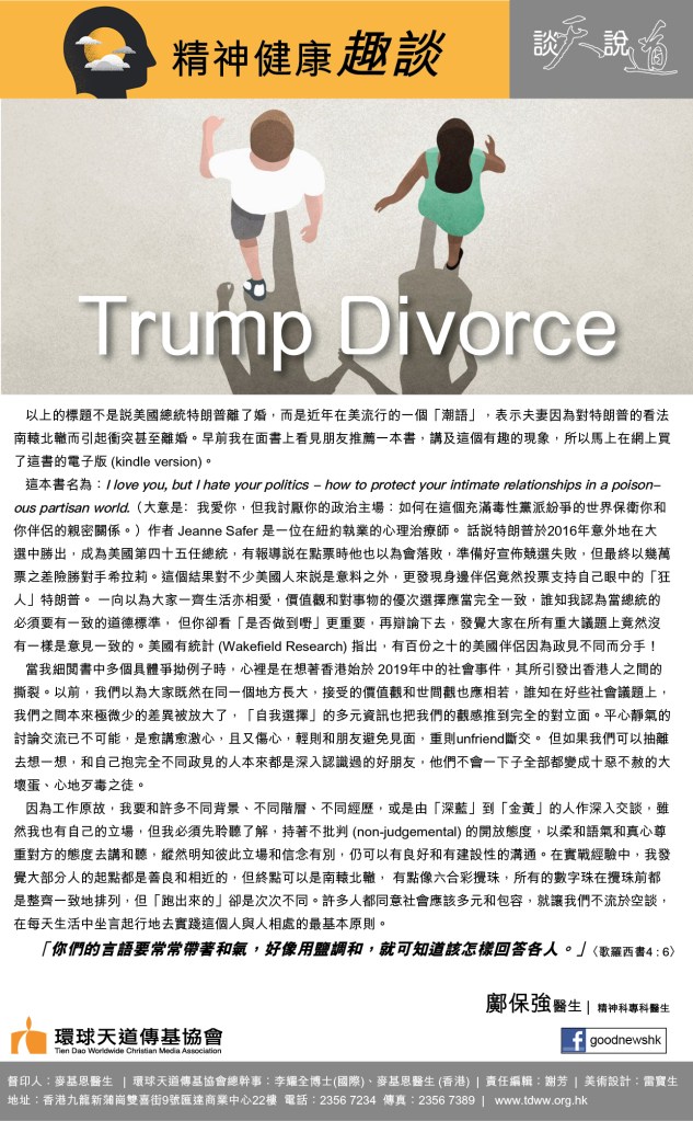 這本書名為﹕I love you, but I hate your politics – how to protect your intimate relationships in a poisonous partisan world. (大意是﹕我愛你,但我討厭你的政治主場:如何在這個充滿毒性黨派紛爭的世界保衛你和你伴侣的親密關係。)作者Jeanne Safer是一位在紐約執業的心理治療師。 話說特朗普於2016年意外地在大選中勝出,成為美國第四十五任總統,有報導說在點票時他也以為會落敗,準備好宣佈競選失敗,但最終以幾萬票之差險勝對手希拉莉。這個結果對不少美國人來說是意料之外,更發現身邊伴侶竟然投票支持自己眼中的「狂人」特朗普。 一向以為大家一齊生活亦相愛,價值觀和對事物的優次選擇應當完全一致,誰知我認為當總統的必須要有一致的道德標準, 但你卻看「是否做到嘢」更重要,再辯論下去,發覺大家在所有重大議題上竟然沒有一樣是意見一致的。美國有統計(Wakefield Research)指出,有百份之十的美國伴侶因為政見不同而分手!