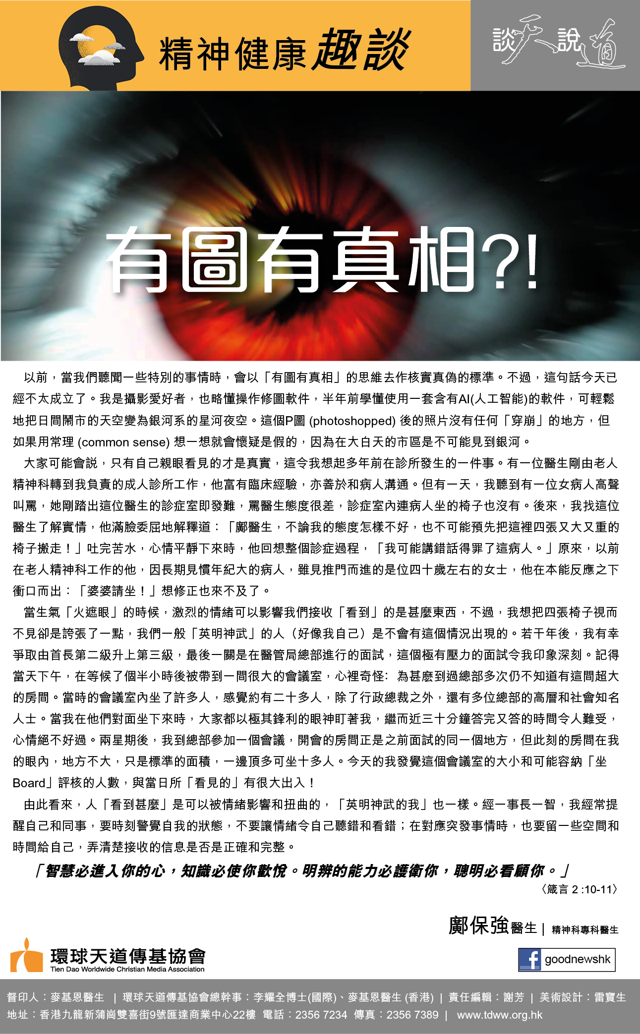 以前,當我們聽聞一些特別的事情時,會以「有圖有真相」的思維去作核實真偽的標準。不過,這句話今天已經不太成立了。我是攝影愛好者,也略懂操作修圖軟件,半年前學懂使用一套含有AI(人工智能)的軟件,可輕鬆地把日間鬧市的天空變為銀河系的星河夜空。這個P圖(photoshopped)後的照片沒有任何「穿崩」的地方,但如果用常理(common sense)想一想就會懷疑是假的,因為在大白天的市區是不可能見到銀河。