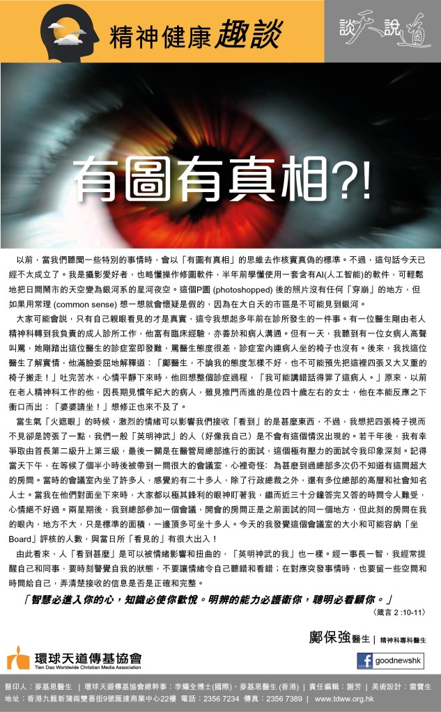 大家可能會說,只有自己親眼看見的才是真實,這令我想起多年前在診所發生的一件事。有一位醫生剛由老人精神科轉到我負責的成人診所工作,他富有臨床經驗,亦善於和病人溝通。但有一天,我聽到有一位女病人高聲叫罵,她剛踏出這位醫生的診症室即發難,罵醫生態度很差,診症室內連病人坐的椅子也沒有。後來,我找這位醫生了解實情,他滿臉委屈地解釋道:「鄺醫生,不論我的態度怎樣不好,也不可能預先把這裡四張又大又重的椅子搬走!」吐完苦水,心情平靜下來時,他回想整個診症過程,「我可能講錯話得罪了這病人。」原來,以前在老人精神科工作的他,因長期見慣年紀大的病人,雖見推門而進的是位四十歲左右的女士,他在本能反應之下衝口而出:「婆婆請坐!」想修正也來不及了。