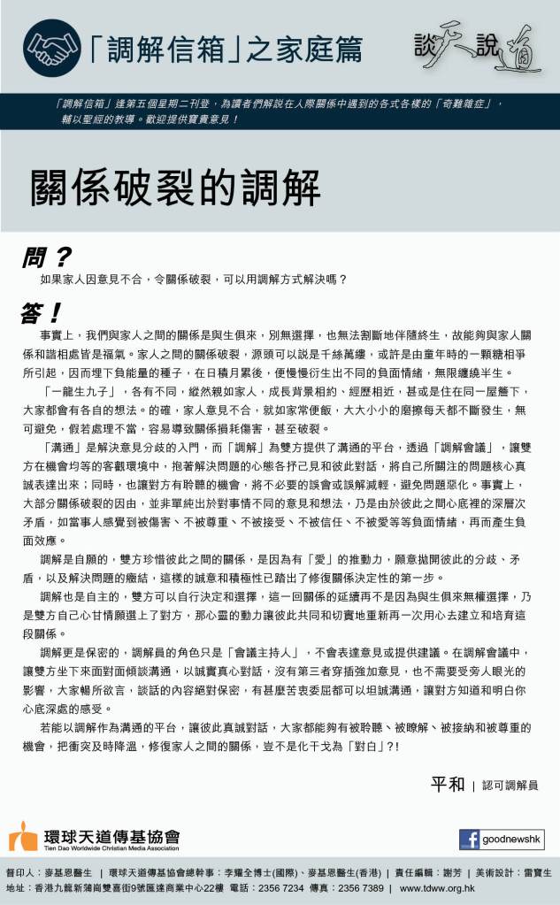 若能以調解作為溝通的平台,讓彼此真誠對話,大家都能夠有被聆聽丶被瞭解丶被接納和被尊重的機會,把衝突及時降溫,修復家人之間的關係,豈不是化干戈為「對白」?!