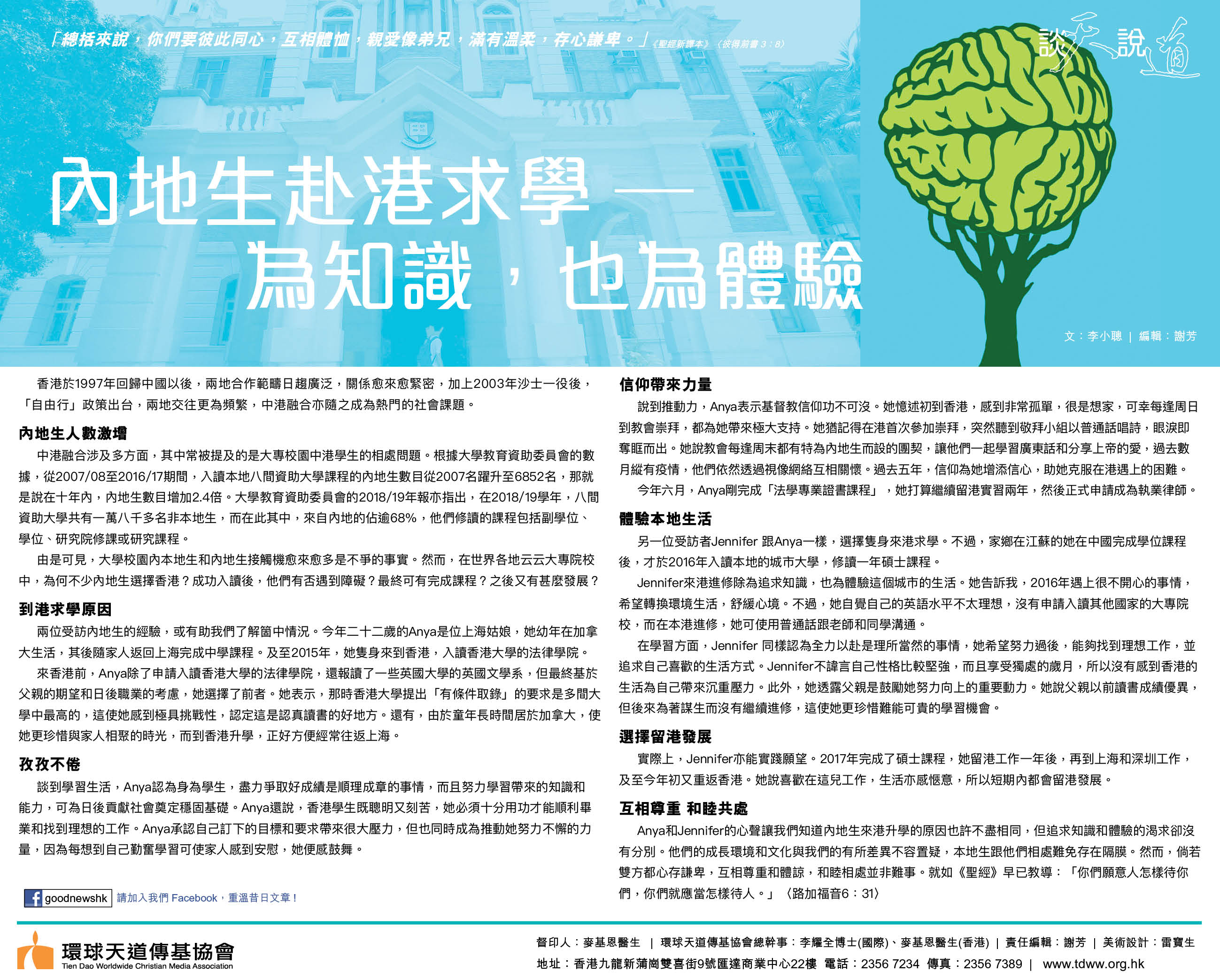 Anya和Jennifer的心聲讓我們知道內地生來港升學的原因也許不盡相同,但追求知識和體驗的渴求卻沒有分別。他們的成長環境和文化與我們的有所差異不容置疑,本地生跟他們相處難免存在隔膜。然而,倘若雙方都心存謙卑,互相尊重和體諒,和睦相處並非難事。就如《聖經》早已教導:「你們願意人怎樣待你們,你們就應當怎樣待人。」〈路加福音6:31〉
