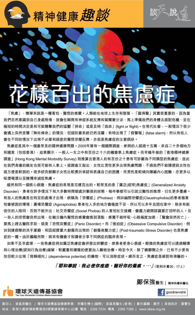 焦慮症是其中一個最常見的精神健康問題。2005年曾有一個國際調查,參與的人超過十五萬,來自二十多個地方和國家(包括香港),結果顯示,一般人一生之中有百份之十六的機會患上焦慮症。而早幾年做的「香港精神健康調查」(Hong Kong Mental Morbidity Survey)則推算出香港人約有百份之十患有可診斷為不同類型的焦慮症,故此在我們身邊的親友也很可能有人患上。這調查又指出,女性比男性更多出現焦慮問題,不過我們不能隨便說女性在這方便是較弱的。很多研究都顯示女性比較勇於承認和表達自己的困擾,而男性是較傾向隱藏內心困難、亦更多以吸煙喝酒以至賭博來減低焦慮。