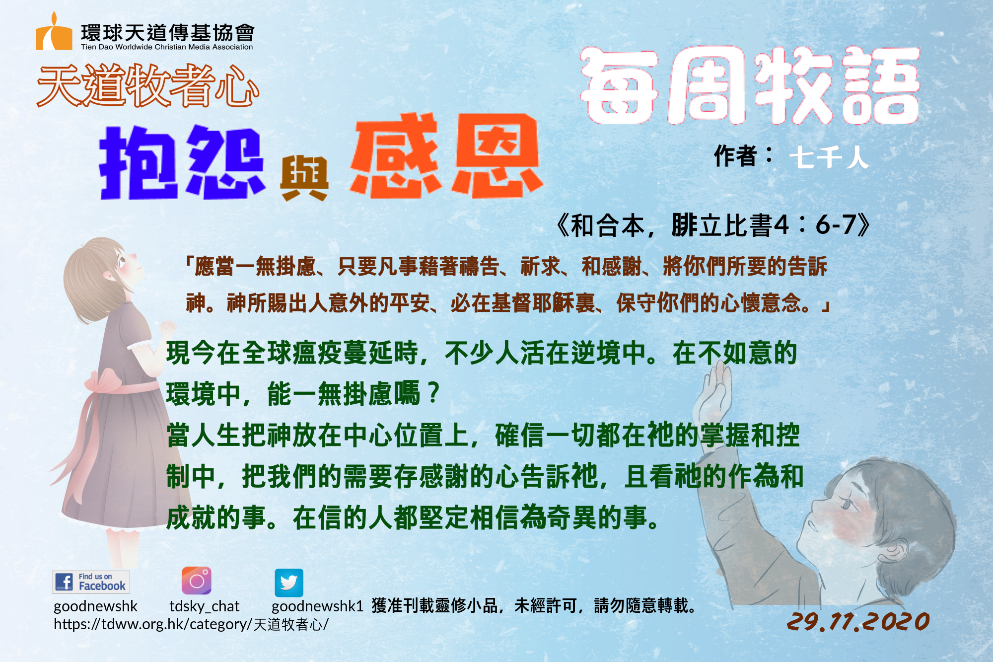 現今在全球瘟疫蔓延時,不少人活在逆境中。在不如意的環境中,能一無掛慮嗎?「……只要凡事藉着禱告、祈求、和感謝、將你們所要的告訴神。」當人生把神放在中心位置上,確信一切都在衪的掌握和控制中,把我們的需要存感謝的心告訴衪,且看祂的作為和成就的事。在信的人都堅定相信為奇異的事。