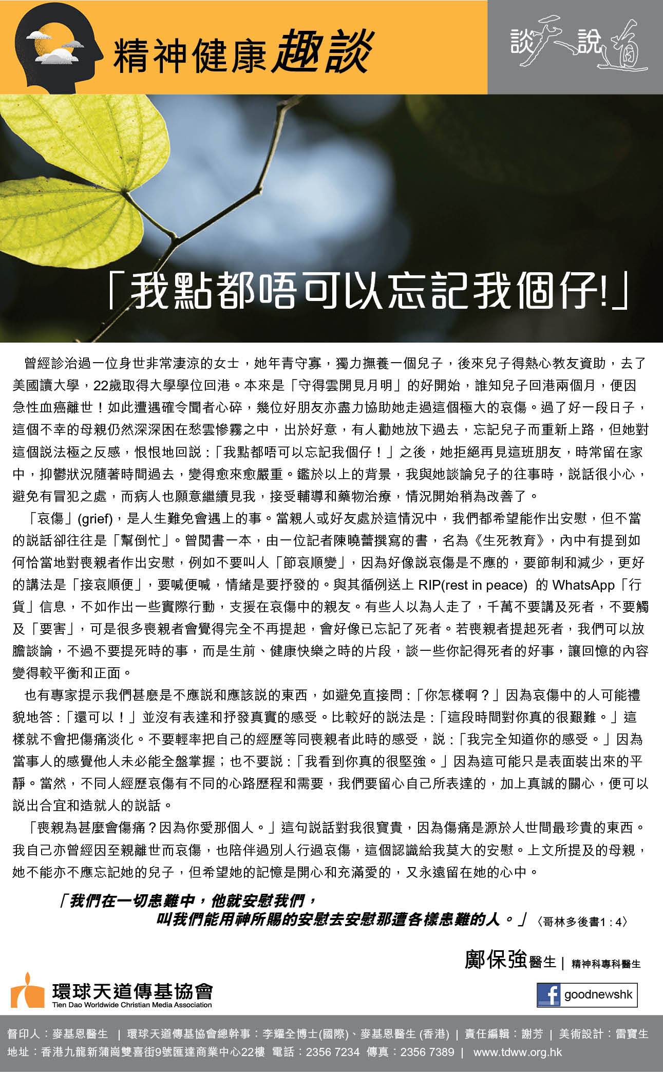 曾經診治過一位身世非常淒涼的女士,她年青守寡,獨力撫養一個兒子,後來兒子得熱心教友資助,去了美國讀大學,22歳取得大學學位回港。本來是「守得雲開見月明」的好開始,誰知兒子回港兩個月,便因急性血癌離世!如此遭遇確令聞者心碎,幾位好朋友亦盡力協助她走過這個極大的哀傷。過了好一段日子,這個不幸的母親仍然深深困在愁雲慘霧之中,出於好意,有人勸她放下過去,忘記兒子而重新上路,但她對這個說法極之反感,恨恨地回說:「我點都唔可以忘記我個仔!」之後,她拒絕再見這班朋友,時常留在家中,抑鬱狀況隨著時間過去,變得愈來愈嚴重。鑑於以上的背景,我與她談論兒子的往事時,說話很小心,避免有冒犯之處,而病人也願意繼續見我,接受輔導和藥物治療,情況開始稍為改善了。