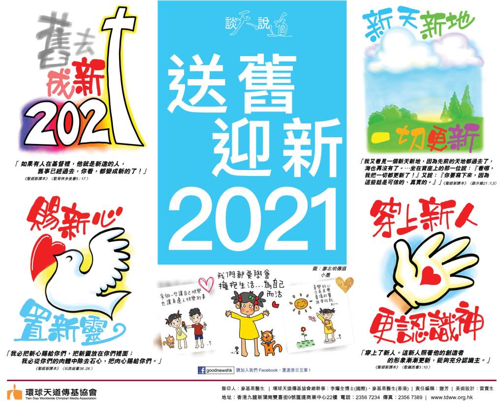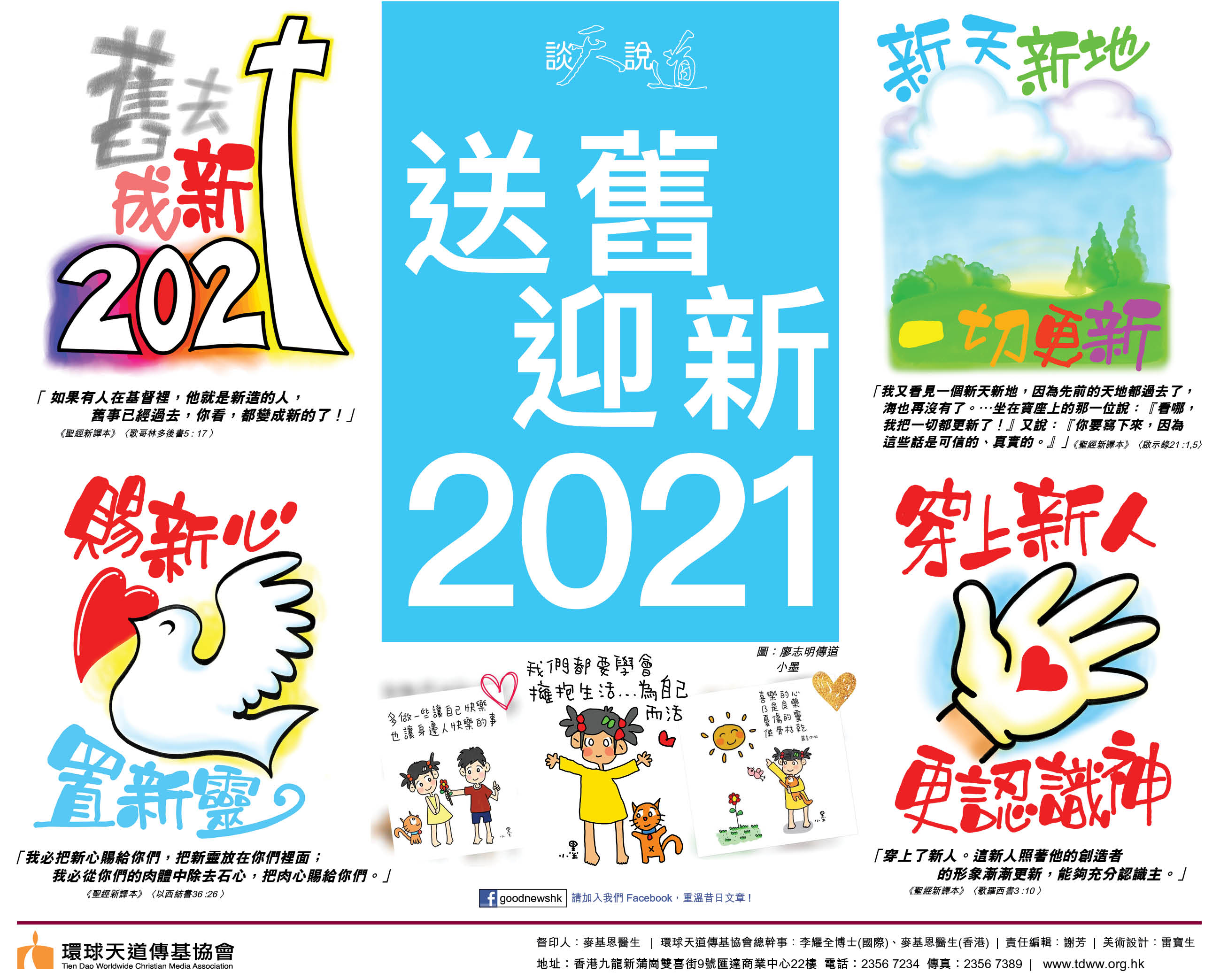 「談天說道」送舊迎新2021 Posted on 2020 年 12 月 28 日 by tdwwhk 圖﹕廖志明傳道小墨 「穿上了新人。這新人照著他的創造者的形象漸漸更新,能夠充分認識主。」《聖經新譯本》〈歌羅西書3﹕10〉 「如果有人在基督裡,他就是新造的人,舊事已經過去,你看,都變成新的了!」《聖經新譯本》〈哥林多後書5﹕17〉 「我又看見一個新天新地,因為先前的天地都過去了,海也再沒有了。…坐在寶座上的那一位說:『看哪,我把一切都更新了!』又說:『你要寫下來,因為這些話是可信的、真實的。』」《聖經新譯本》〈啟示錄21﹕1,5〉 「我必把新心賜給你們,把新靈放在你們裡面;我必從你們的肉體中除去石心,把肉心賜給你們。」《聖經新譯本》〈以西結書36﹕26〉 分享此文: 分享到 WhatsApp(在新視窗中開啟) WhatsApp Tweet 按一下即可以電子郵件傳送連結給朋友(在新視窗中開啟) 電子郵件 喜歡 正在載入...