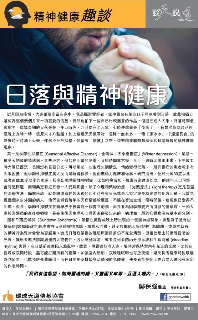 近月因為疫情,大家都要多留在家中。我是攝影愛好者,家中露台在某些日子可以看到日落,故此拍攝日落成為這個幾個月來一個喜愛的活動,偶然也拍下一些自己比較滿意的作品。但因已進入冬季,日落時間愈來愈早,這幾星期的日落是在下午五時許,六時便完全入黑,七時便感覺是「夜深了」。有幾次我以為已經是晚上九時十時,但原來才八點鐘!加上這幾天天氣寒冷,急降十度有多,一種「凍冰冰」、「漫漫長夜」的感覺時不時湧上心頭,雖然不至於抑鬱,但卻有「落寞」之感。這些讓我聯想起兩個和日落有關的精神健康現象。