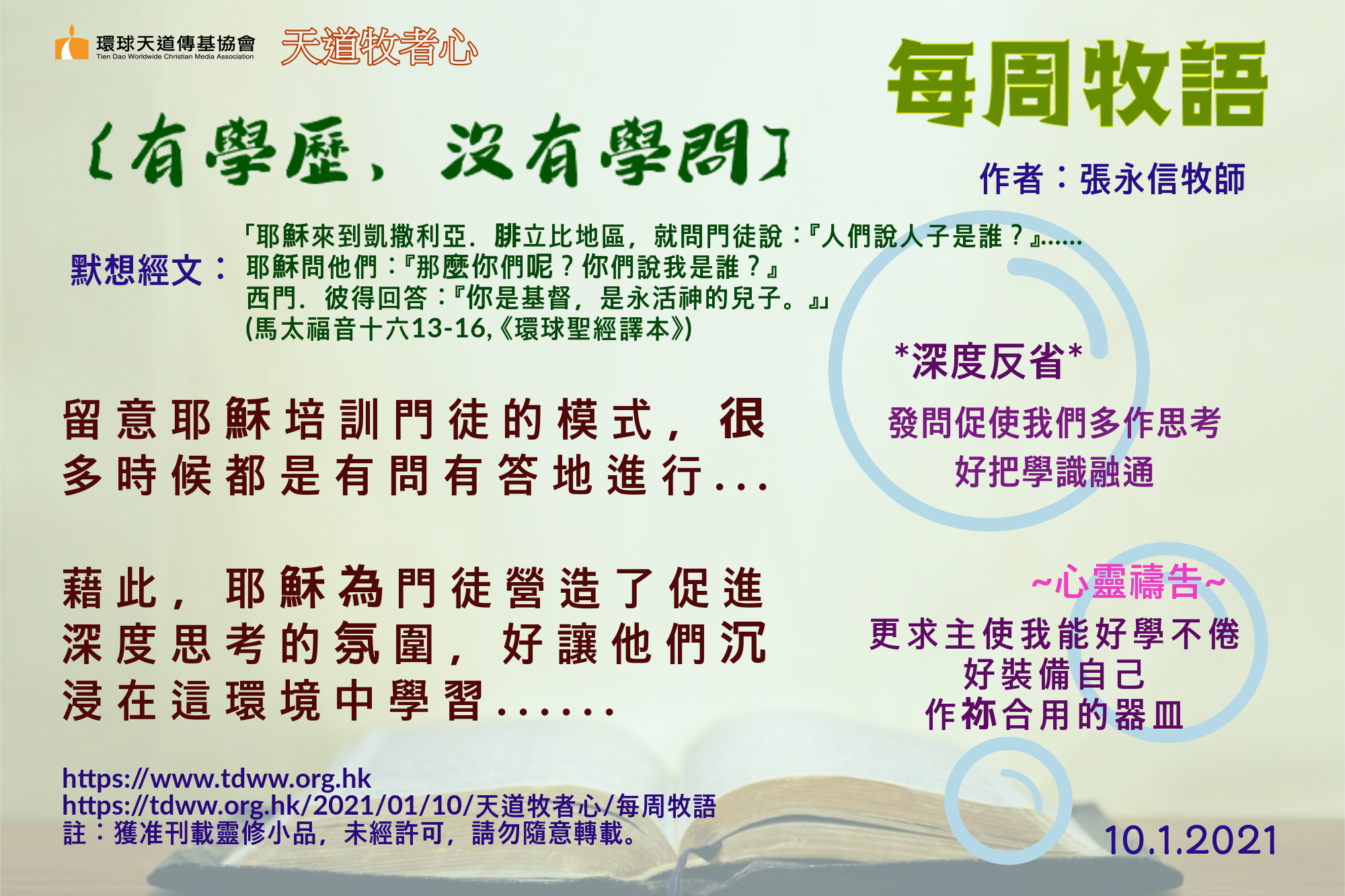 學問者,邊學邊問之謂也。留意耶穌培訓門徒的模式,很多時候都是有問有答地進行(見太十五12、十九25、二十四3;可八27-29;路十一41、二十一7;徒一6)。藉此,耶穌為門徒營造了促進深度思考的氛圍,好讓他們沉浸在這環境中學習,目的是要他們把學識融通。