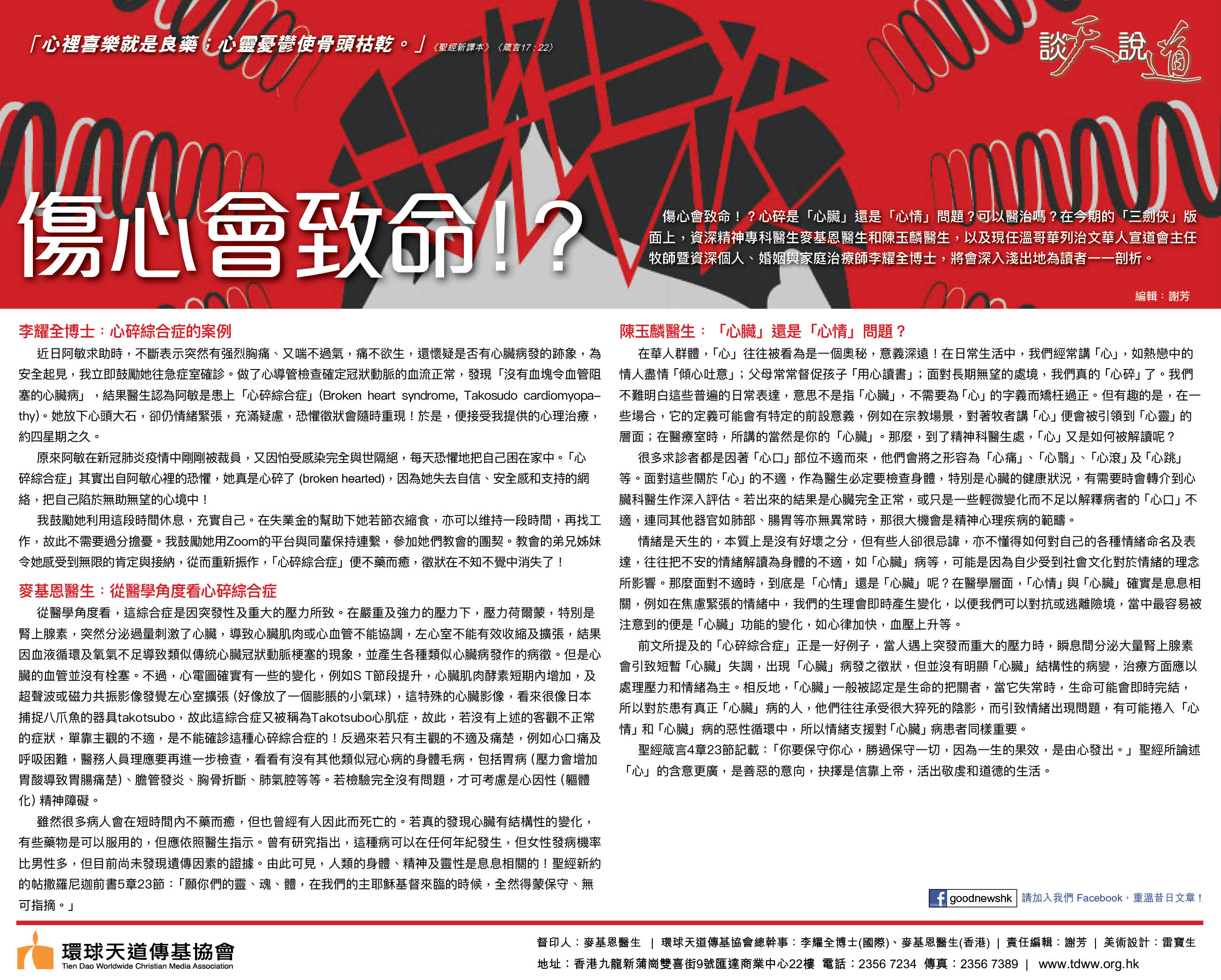 傷心會致命!?心碎是「心臟」還是「心情」問題?可以醫治嗎?在今期的「三劍俠」版面上,資深精神專科醫生麥基恩醫生和陳玉麟醫生,以及現任溫哥華列治文華人宣道會主任牧師暨資深個人、婚姻與家庭治療師李耀全博士,將會深入淺出地為讀者一一剖析。