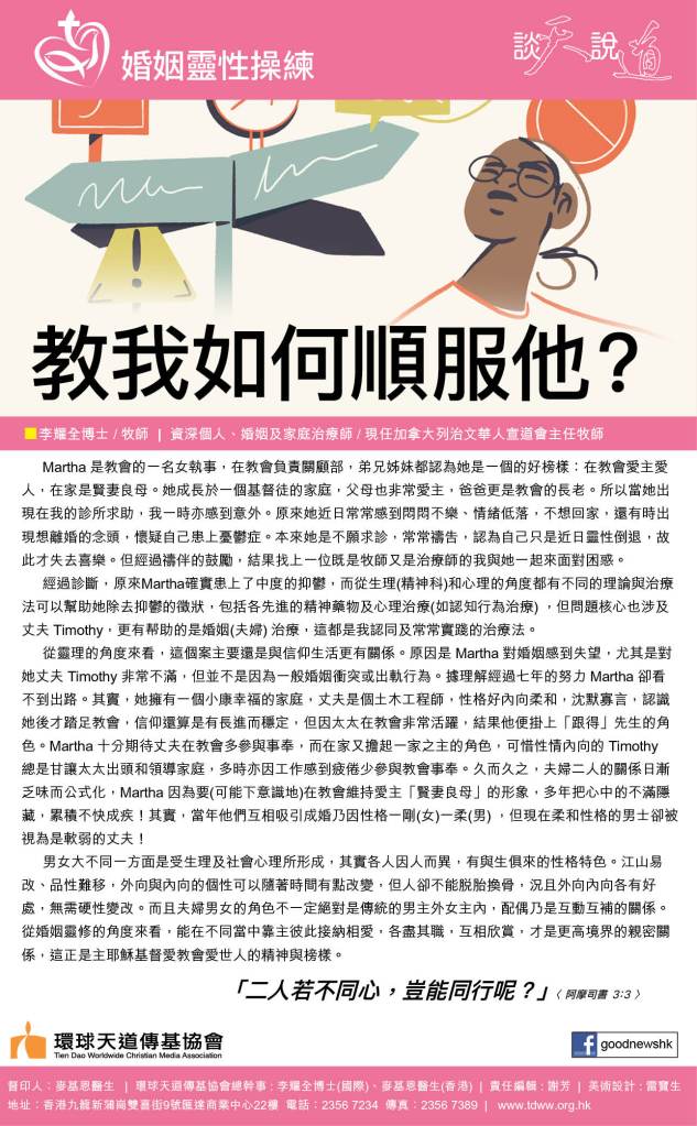 從靈理的角度來看,這個案主要還是與信仰生活更有關係。原因是Martha對婚姻感到失望,尤其是對她丈夫Timothy非常不滿,但並不是因為一般婚姻衝突或出軌行為。據理解經過七年的努力Martha卻看不到出路。其實,她擁有一個小康幸福的家庭,丈夫是個土木工程師,性格内向柔和,沈默寡言,認識她後才踏足教會,信仰還算是有長進而穩定,但因太太在教會非常活躍,結果他便掛上「跟得」先生的角色。Martha卻十分期待丈夫在教會多參與事奉,而在家又擔起一家之主的角色,可惜性情内向的Timothy總是甘讓太太出頭和領導家庭,多時亦因工作感到疲倦少參與教會事奉。久而久之,夫婦二人的關係日漸乏味而公式化。Martha 因為要(可能下意識地)在教會維持愛主「賢妻良母」的形象,多年把心中的不滿隱藏,累積不快成疾!其實,當年他們互相吸引成婚乃因性格一剛(女)一柔(男) ,但現在柔和性格的男士卻被視為是軟弱的丈夫!