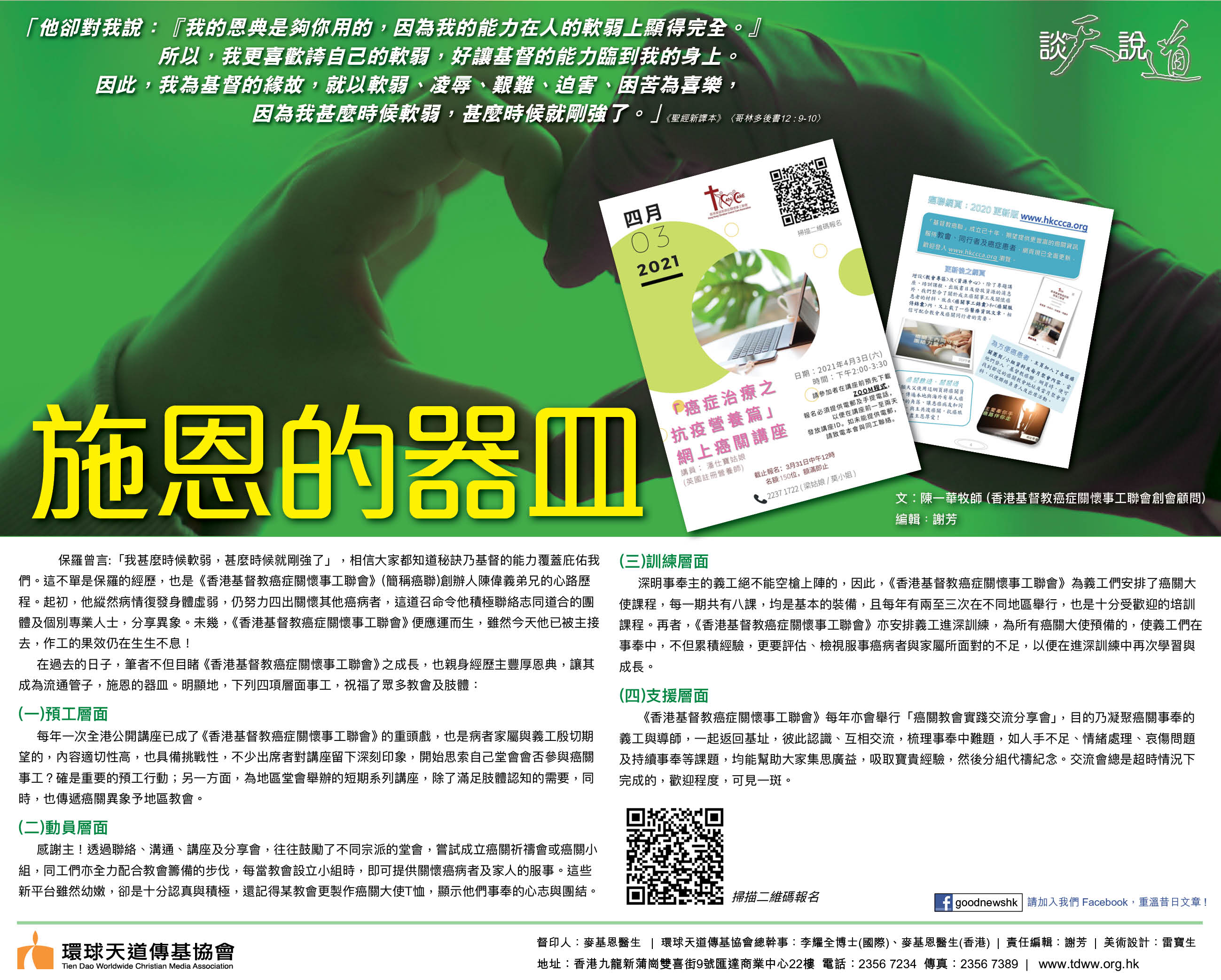 在過去的日子,筆者不但目睹《香港基督教癌症關懷事工聯會》之成長,也親身經歷主豐厚恩典,讓其成為流通管子,施恩的器皿。明顯地,下列四項層面事工,祝福了眾多教會及肢體: