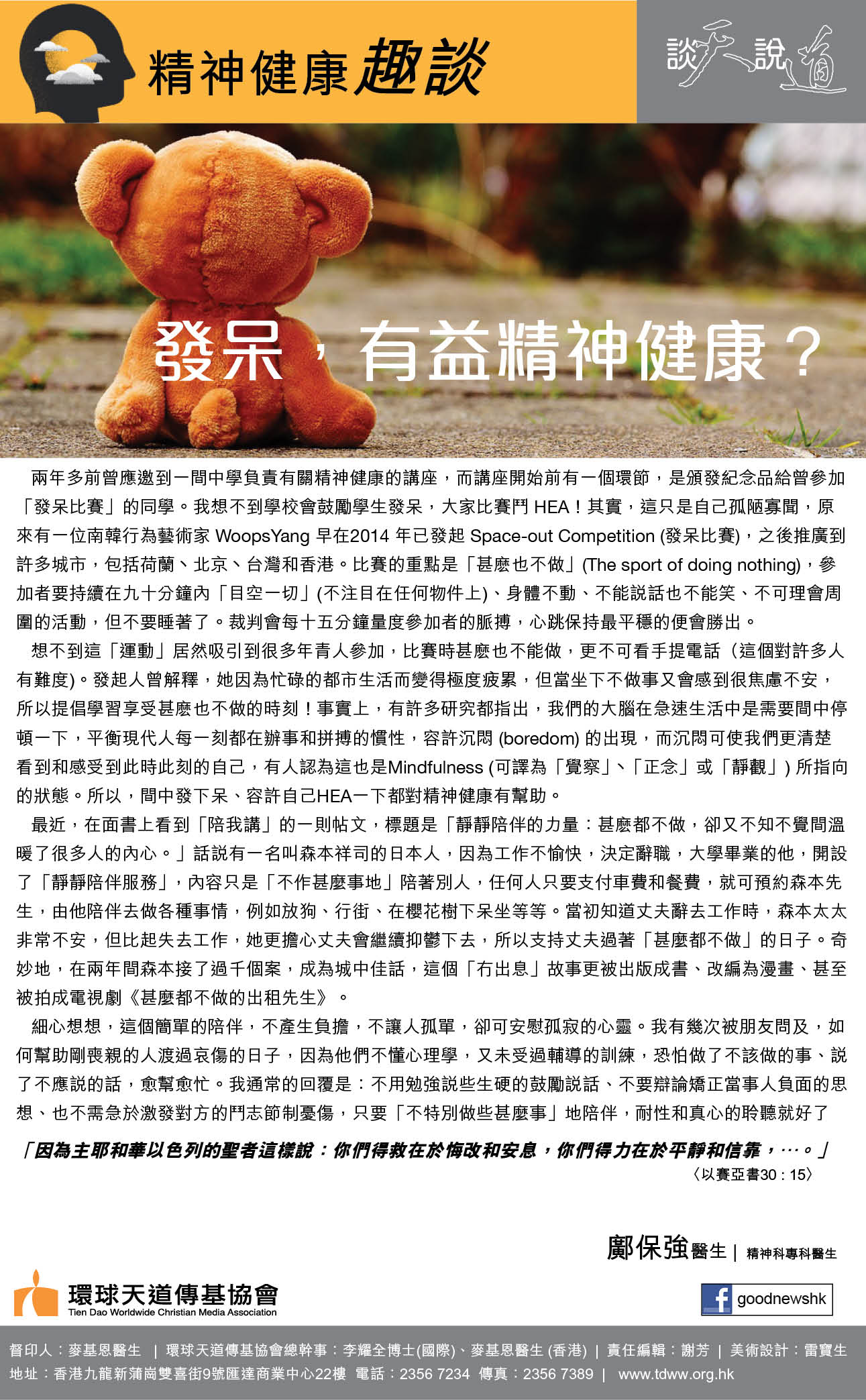 兩年多前曾應邀到一間中學負責有關精神健康的講座,而講座開始前有一個環節,是頒發紀念品給曾參加「發呆比賽」的同學。我想不到學校會鼓勵學生發呆,大家比賽鬥HEA!其實,這只是自己孤陋寡聞,原來有一位南韓行為藝術家WoopsYang 早在2014 年已發起 Space-out Competition (發呆比賽),之後推廣到許多城市,包括荷蘭丶北京丶台灣和香港。比賽的重點是「甚麽也不做」(The sport of doing nothing),參加者要持續在九十分鐘內「目空一切」(不注目在任何物件上)、身體不動、不能說話也不能笑、不可理會周圍的活動,但不要睡著了。裁判會每十五分鐘量度參加者的脈搏,心跳保持最平穩的便會勝出。