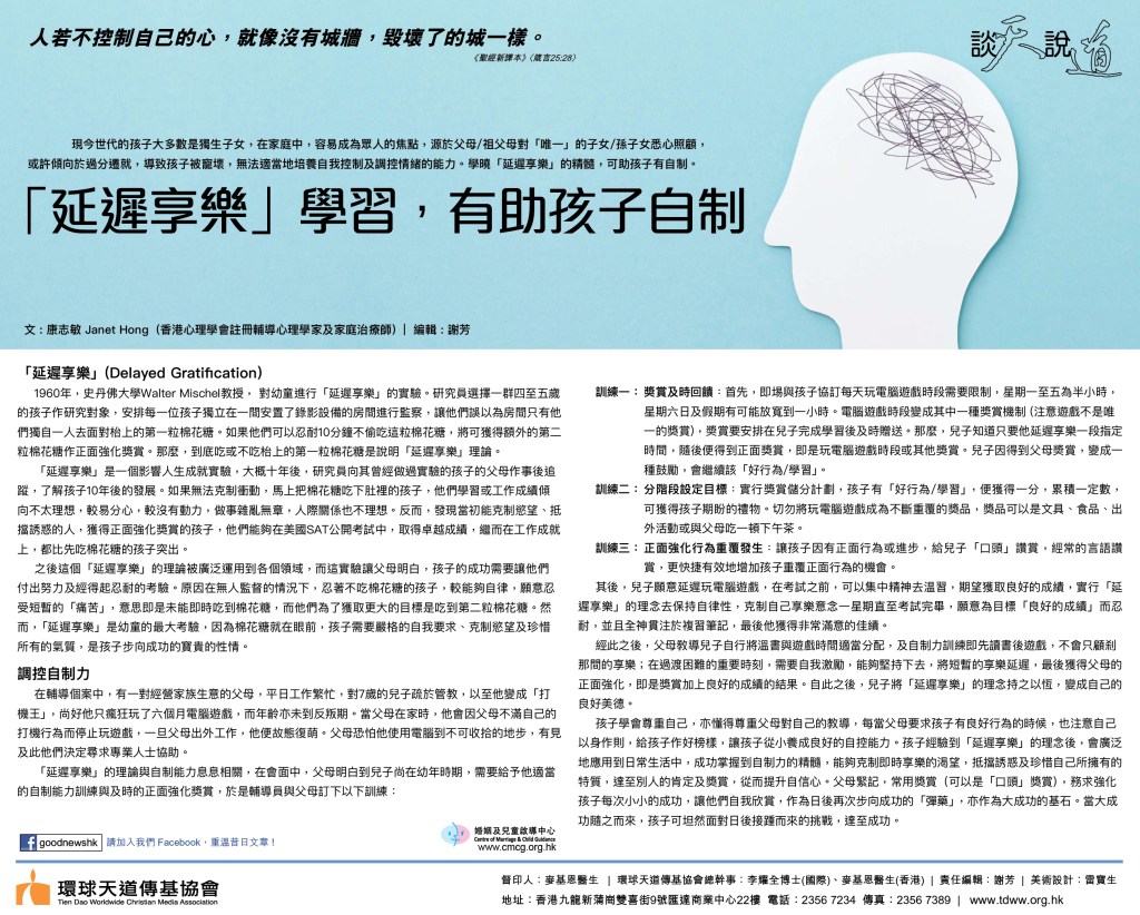 現今世代的孩子大多數是獨生子女,在家庭中,容易成為眾人的焦點,源於父母/祖父母對「唯一」的子女/孫子女悉心照顧,或許傾向於過分遷就,導致孩子被寵壞,無法適當地培養自我控制及調控情緒的能力。學曉「延遲享樂」的精髓,可助孩子有自制。
