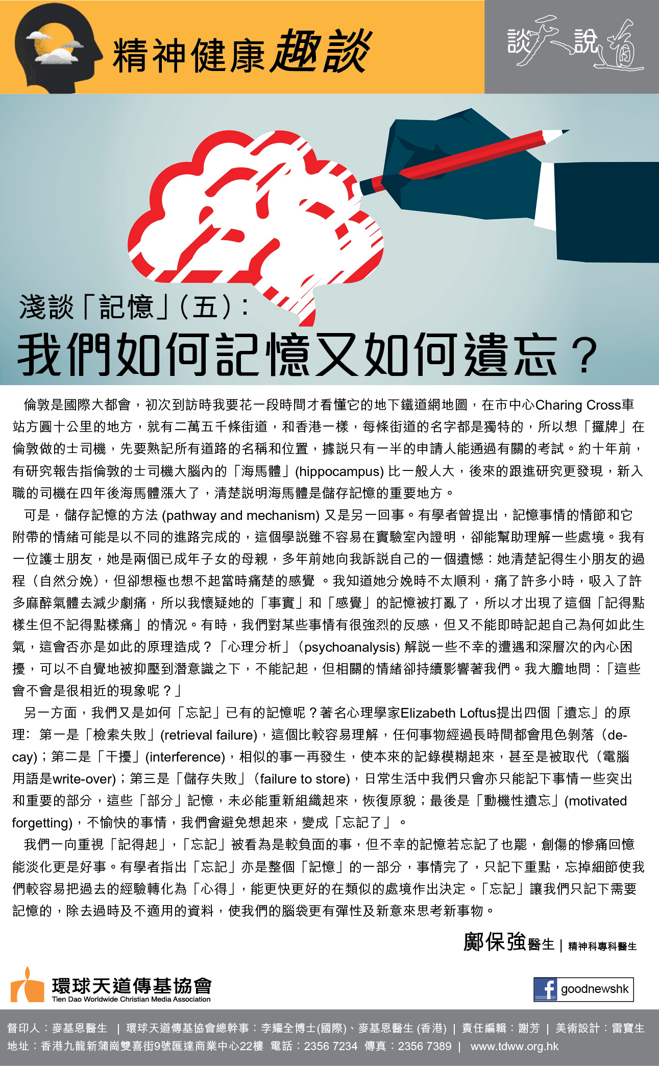 另一方面,我們又是如何「忘記」已有的記憶呢?著名心理學家Elizabeth Loftus提出四個「遺忘」的原理﹕第一是「檢索失敗」(retrieval failure),這個比較容易理解,任何事物經過長時間都會甩色剝落(decay);第二是「干擾」(interference),相似的事一再發生,使本來的記錄模糊起來,甚至是被取代(電腦用語是write-over);第三是「儲存失敗」(failure to store),日常生活中我們只會亦只能記下事情一些突出和重要的部分,這些「部分」記憶,未必能重新組織起來,恢復原貌;最後是「動機性遺忘」(motivated forgetting),不愉快的事情,我們會避免想起來,變成「忘記了」。