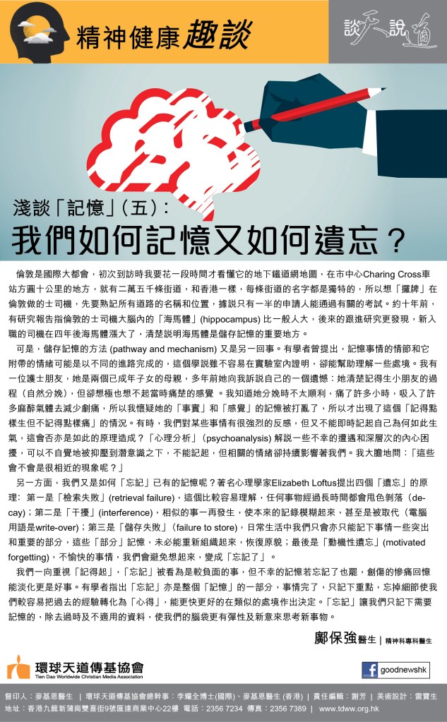 可是,儲存記憶的方法(pathway and mechanism)又是另一回事。有學者曾提出,記憶事情的情節和它附帶的情緒可能是以不同的進路完成的,這個學說雖不容易在實驗室內證明,卻能幫助理解一些處境。我有一位護士朋友,她是兩個已成年子女的母親,多年前她向我訴說自己的一個遺憾:她清楚記得生小朋友的過程(自然分娩),但卻想極也想不起當時痛楚的感覺 。我知道她分娩時不太順利,痛了許多小時,吸入了許多麻醉氣體去減少劇痛,所以我懷疑她的「事實」和「感覺」的記憶被打亂了,所以才出現了這個「記得點樣生但不記得點樣痛」的情況。有時,我們對某些事情有很強烈的反感,但又不能即時記起自己為何如此生氣,這會否亦是如此的原理造成?「心理分析」(psychoanalysis)解說一些不幸的遭遇和深層次的內心困擾,可以不自覺地被抑壓到潛意識之下,不能記起,但相關的情緒卻持續影響著我們。我大膽地問:「這些會不會是很相近的現象呢?」