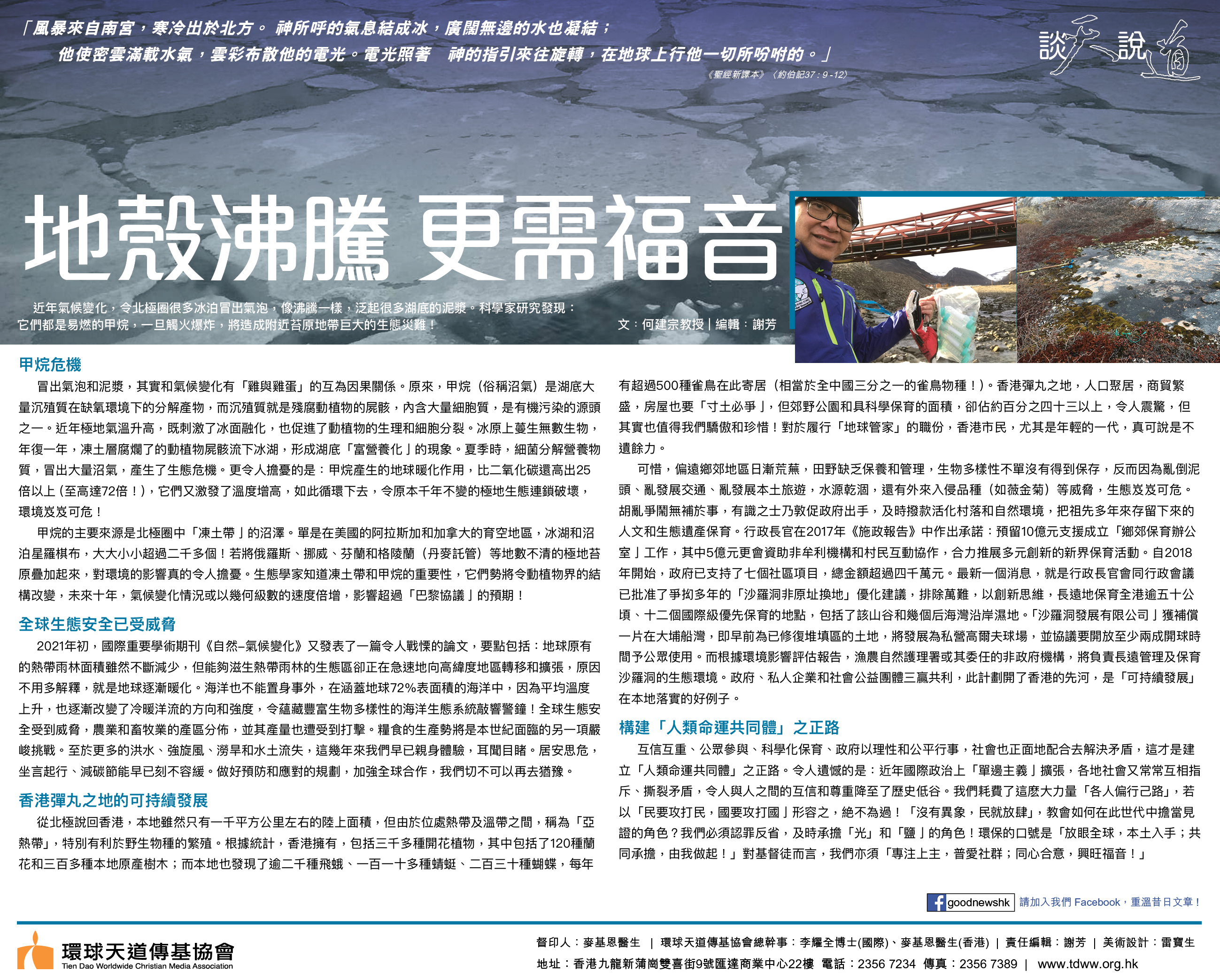 2021年初,國際重要學術期刊《自然-氣候變化》又發表了一篇令人戰慄的論文,要點包括:地球原有的熱帶雨林面積雖然不斷減少,但能夠滋生熱帶雨林的生態區卻正在急速地向高緯度地區轉移和擴張,原因不用多解釋,就是地球逐漸暖化。海洋也不能置身事外,在涵蓋地球72%表面積的海洋中,因為平均溫度上升,也逐漸改變了冷暖洋流的方向和強度,令蘊藏豐富生物多樣性的海洋生態系統敲響警鐘!全球生態安全受到威脅,農業和畜牧業的產區分佈,並其產量也遭受到打擊。糧食的生產勢將是本世紀面臨的另一項嚴峻挑戰。至於更多的洪水、強旋風、澇旱和水土流失,這幾年來我們早已親身體驗,耳聞目睹。居安思危,坐言起行、減碳節能早已刻不容緩。做好預防和應對的規劃,加強全球合作,我們切不可以再去猶豫。