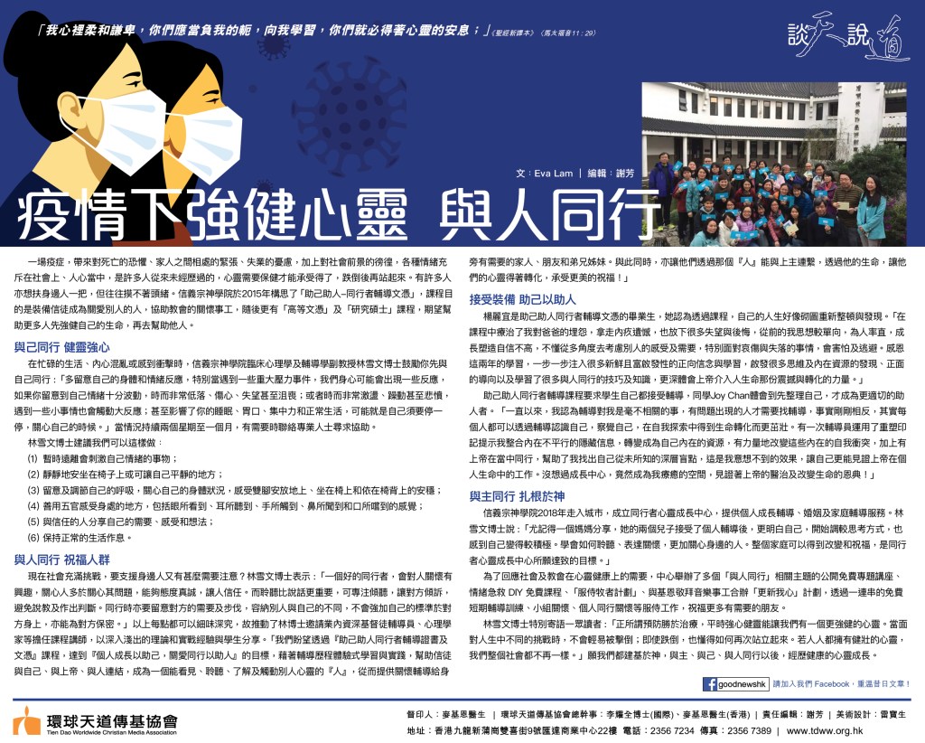 為了回應社會及教會在心靈健康上的需要,中心舉辦了多個「與人同行」相關主題的公開免費專題講座、情緒急救 DIY 免費課程、「服侍牧者計劃」、與基恩敬拜音樂事工合辦「更新我心」計劃,透過一連串的免費短期輔導訓練、小組關懷、個人同行關懷等服侍工作,祝福更多有需要的朋友。