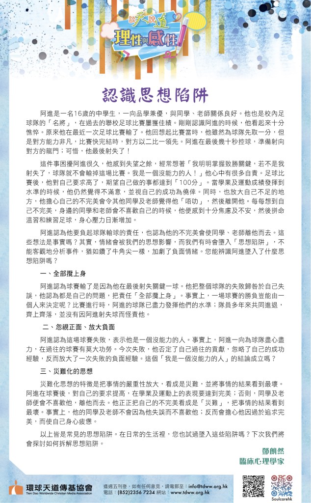 以上皆是常見的思想陷阱。在日常的生活裡,您也試過墜入這些陷阱嗎?下次我們將會探討如何拆解思想陷阱。