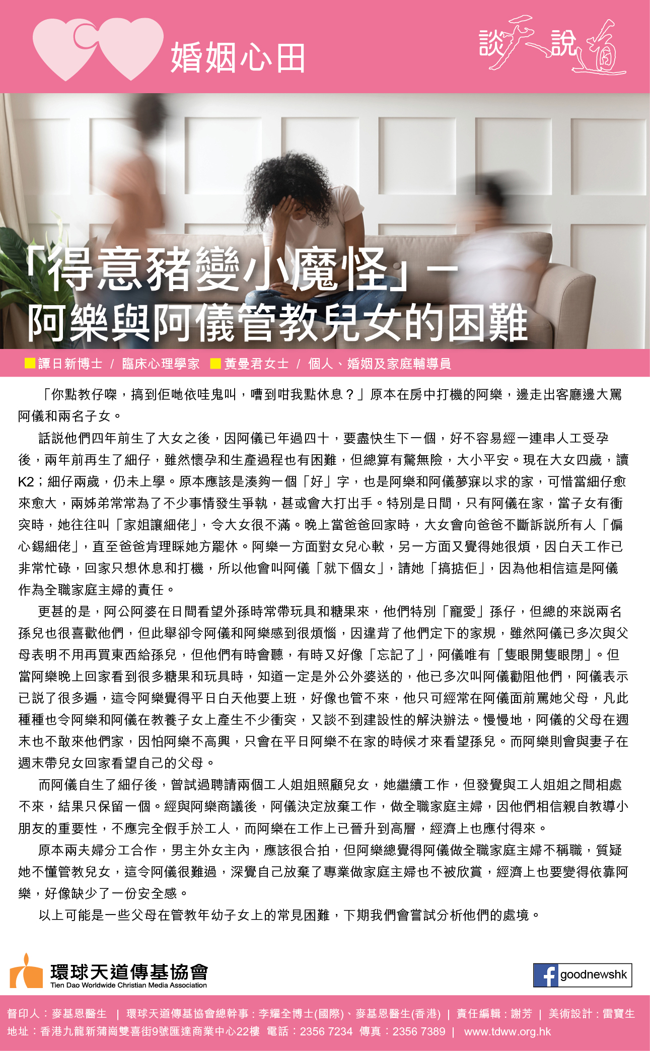 話說他們四年前生了大女之後,因阿儀已年過四十,要盡快生下一個,好不容易經一連串人工受孕後,兩年前再生了細仔,雖然懷孕和生產過程也有困難,但總算有驚無險,大小平安。現在大女四歲,讀K2;細仔兩歲,仍未上學。原本應該是湊夠一個「好」字,也是阿樂和阿儀夢寐以求的家,可惜當細仔愈來愈大,兩姊弟常常為了不少事情發生爭執,甚或會大打出手。特別是日間,只有阿儀在家,當子女有衝突時,她往往叫「家姐讓細佬」,令大女很不滿。晚上當爸爸回家時,大女會向爸爸不斷訴說所有人「偏心錫細佬」,直至爸爸肯理睬她方罷休。阿樂一方面對女兒心軟,另一方面又覺得她很煩,因白天工作已非常忙碌,回家只想休息和打機,所以他會叫阿儀「就下個女」,請她「搞掂佢」,因為他相信這是阿儀作為全職家庭主婦的責任。