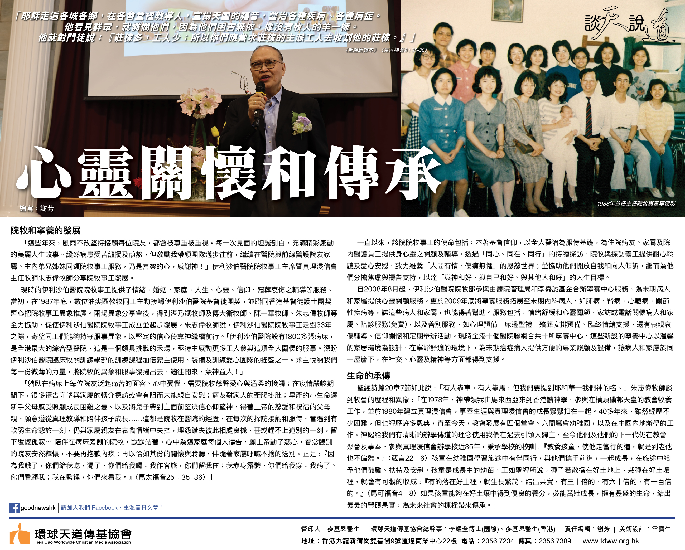 「躺臥在病床上每位院友泛起痛苦的面容、心中憂懼,需要院牧慈聲愛心與溫柔的接觸;在疫情嚴峻期間下,很多禱告守望與家屬的轉介探訪或會有阻而未能親自安慰;病友對家人的牽腸掛肚;早產的小生命讓新手父母感受照顧成長困難之憂。以及將兒子帶到主面前堅決信心仰望神,得著上帝的慈愛和祝福的父母親,願意遵從真理教導和陪伴孩子成長……這都是院牧在醫院的經歷,在每次的探訪接觸和服侍,當遇到有軟弱生命懸於一刻,仍與家屬親友在哀慟情緒中失控,埋怨錯失彼此相處良機,甚或趕不上道別的一刻,留下遺憾孤寂……陪伴在病床旁側的院牧,默默站著,心中為這家庭每個人禱告,願上帝動了慈心,眷念臨別的院友安然釋懷,不要再抱歉內疚;再以恰如其份的關懷與聆聽,伴隨著家屬呼喊不捨的送別。正是﹕『因為我餓了,你們給我吃,渴了,你們給我喝;我作客旅,你們留我住;我赤身露體,你們給我穿;我病了、你們看顧我;我在監裡,你們來看我。』〈馬太福音25﹕35-36〉」
