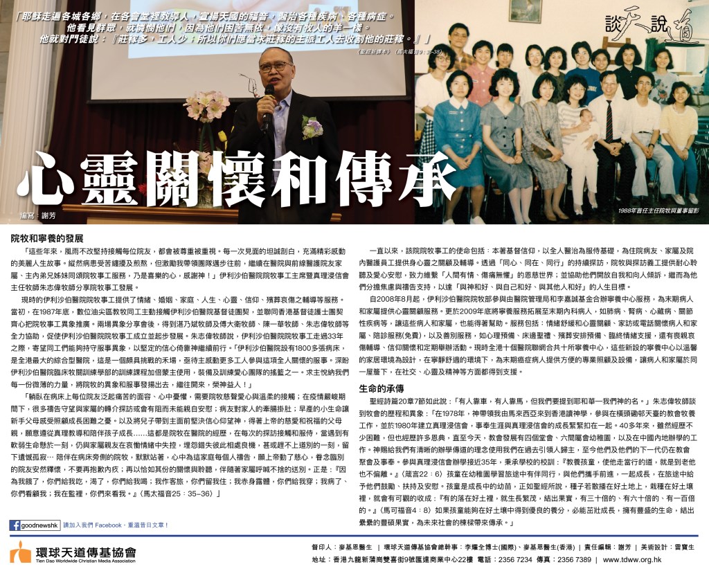 「這些年來,風雨不改堅持接觸每位院友,都會被尊重被重視。每一次見面的坦誠剖白,充滿精彩感動的美麗人生故事。縱然病患受苦纏擾及煎熬,但激勵我帶領團隊邁步往前,繼續在醫院與前線醫護院友家屬、主內弟兄姊妹同頌院牧事工服務,乃是喜樂的心,感謝神!」伊利沙伯醫院院牧事工主席暨真理浸信會主任牧師朱志偉牧師分享院牧事工發展。