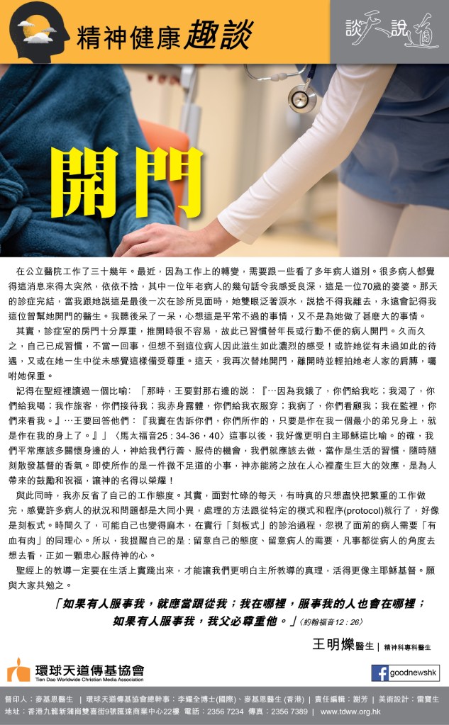 在公立醫院工作了三十幾年。最近,因為工作上的轉變,需要跟一些看了多年病人道別。很多病人都覺得這消息來得太突然,依依不捨,其中一位年老病人的幾句話令我感受良深,這是一位70歲的婆婆。那天的診症完结,當我跟她說這是最後一次在診所見面時,她雙眼泛著淚水,說捨不得我離去,永遠會記得我這位曾幫她開門的醫生。我聽後呆了一呆,心想這是平常不過的事情,又不是為她做了甚麽大的事情。