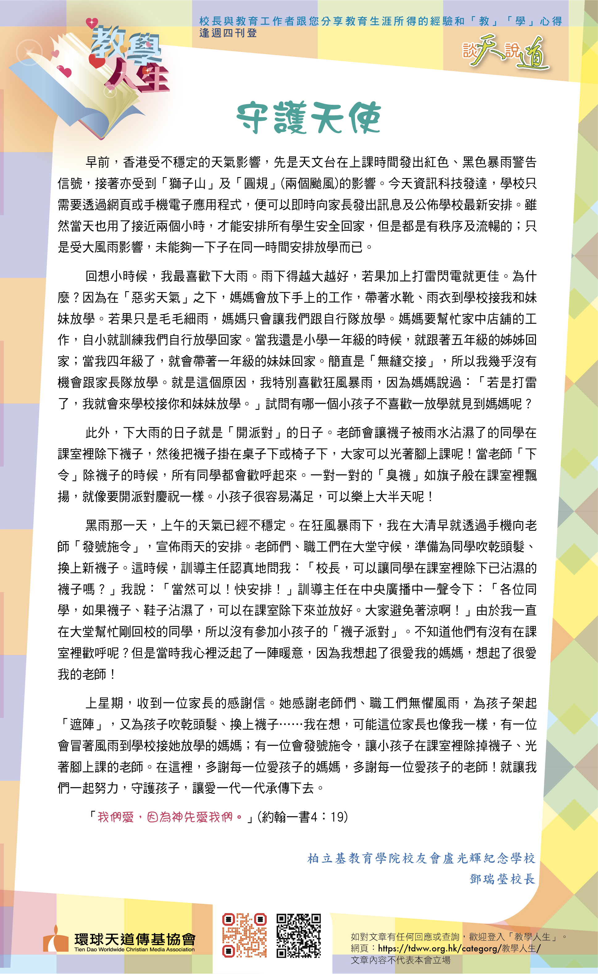 上星期,收到一位家長的感謝信。她感謝老師們、職工們無懼風雨,為孩子架起「遮陣」,又為孩子吹乾頭髮、換上襪子……我在想,可能這位家長也像我一樣,有一位會冒著風雨到學校接她放學的媽媽;有一位會發號施令,讓小孩子在課室裡除掉襪子、光著腳上課的老師。在這裡,多謝每一位愛孩子的媽媽,多謝每一位愛孩子的老師!就讓我們一起努力,守護孩子,讓愛一代一代承傳下去。