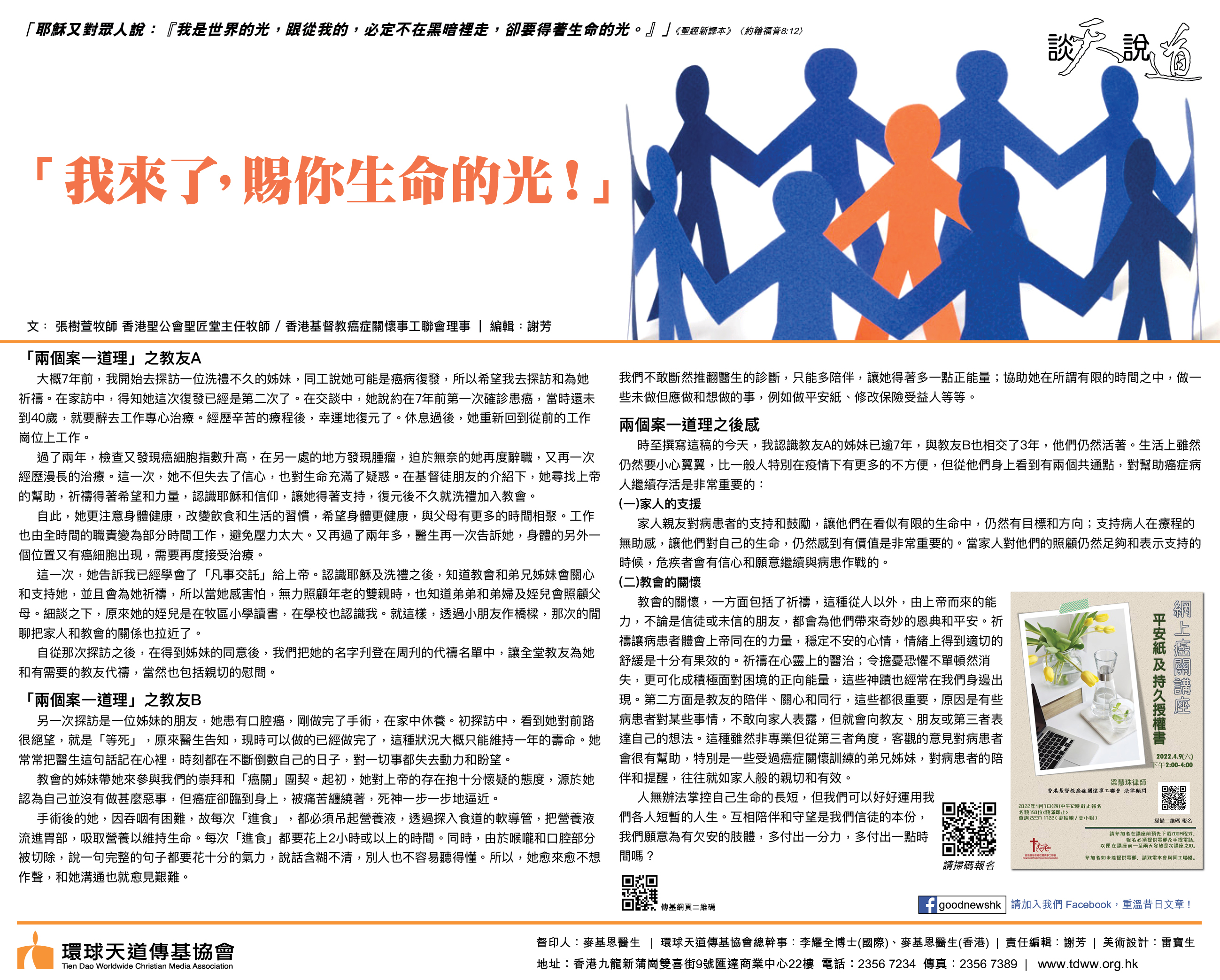 時至撰寫這稿的今天,我認識教友A的姊妹已逾7年,與教友B也相交了3年,他們仍然活著。生活上雖然仍然要小心翼翼,比一般人特別在疫情下有更多的不方便,但從他們身上看到有兩個共通點,對幫助癌症病人繼續存活是非常重要的: