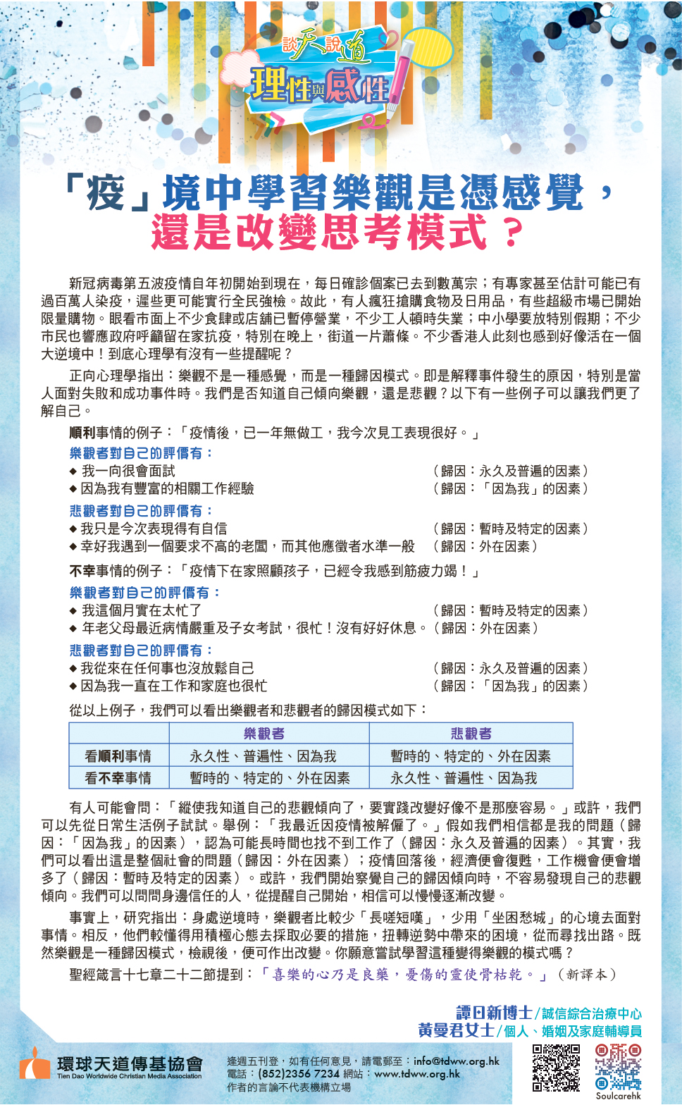 事實上,研究指出:身處逆境時,樂觀者比較少「長嗟短嘆」,少用「坐困愁城」的心境去面對事情。相反,他們較懂得用積極心態去採取必要的措施,扭轉逆勢中帶來的困境,從而尋找出路。既然樂觀是一種歸因模式,檢視後,便可作出改變。你願意嘗試學習這種變得樂觀的模式嗎?