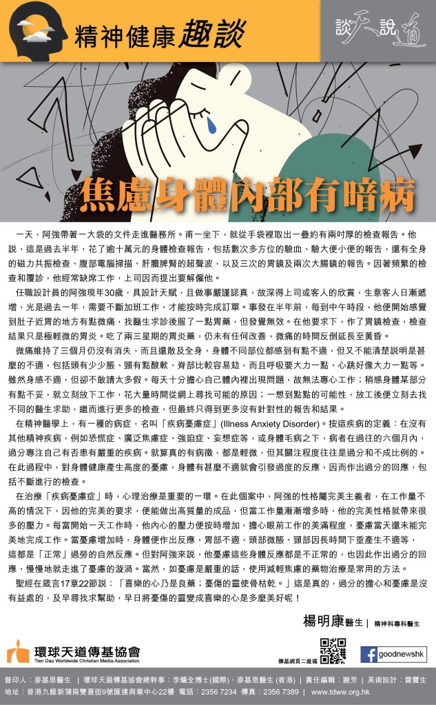 在精神醫學上,有一種的病症,名叫「疾病憂慮症」(Illness Anxiety Disorder)。按這疾病的定義:在沒有其他精神疾病,例如恐慌症、廣泛焦慮症、強廹症、妄想症等,或身體毛病之下,病者在過往的六個月內,過分專注自己有否患有嚴重的疾病。就算真的有病徵,都是輕微,但其關注程度往往是過分和不成比例的。在此過程中,對身體健康產生高度的憂慮,身體有甚麼不適就會引發過度的反應,因而作出過分的回應,包括不斷進行的檢查。